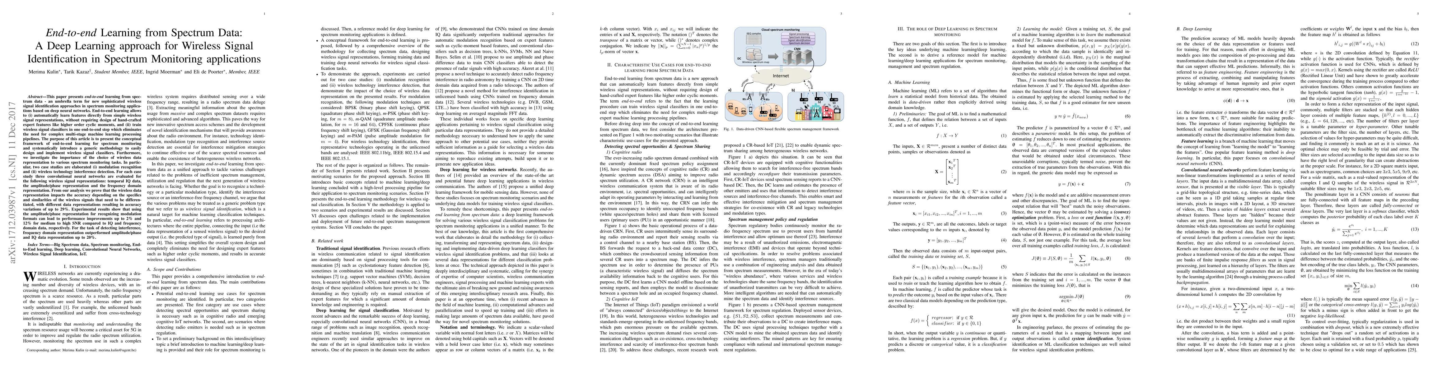 This paper introduces end-to-end learning for wireless signal identification using deep neural networks, eliminating the need for hand-crafted features and complex multi-stage pipelines. It evaluates the impact of different wireless data representations on modulation recognition and interference detection, showing significant accuracy variations based on the specific task.