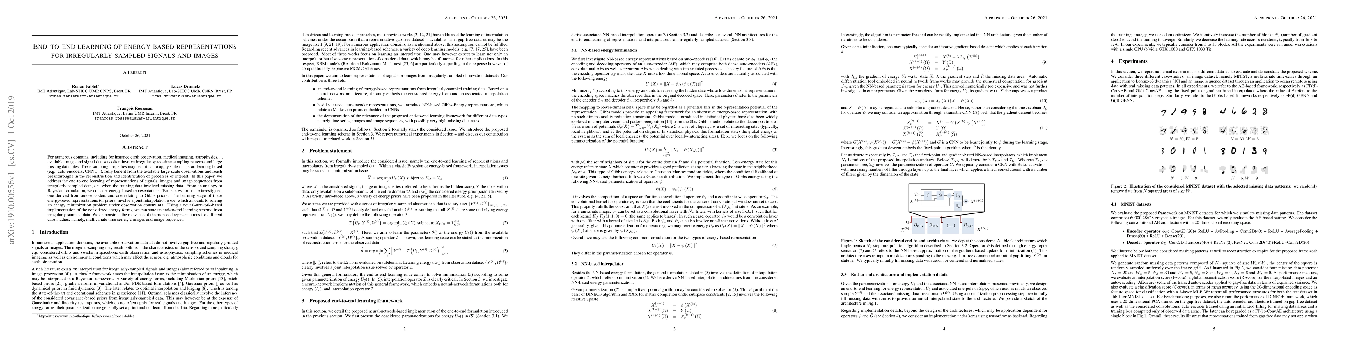 This paper proposes an end-to-end learning method for energy-based representations of irregularly-sampled signals and images, addressing large missing data rates. It investigates two energy forms and demonstrates their effectiveness in reconstructing and identifying processes in domains like earth observation and medical imaging.