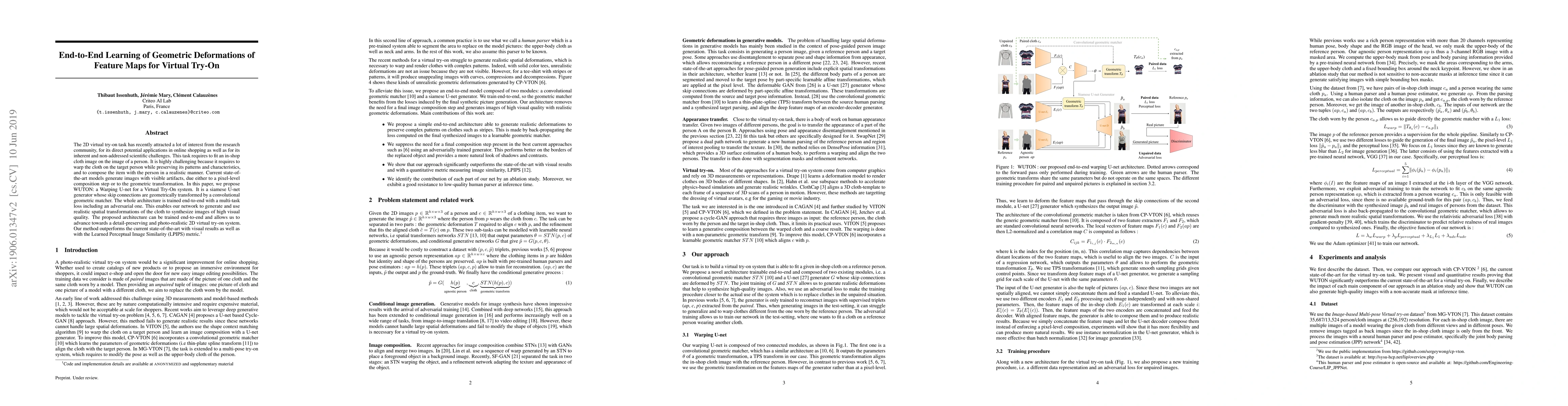 This paper introduces WUTON, a Warping U-net for virtual try-on systems, which uses geometrically transformed skip connections to achieve realistic cloth deformation and composition. The end-to-end trained model outperforms current methods in generating high-quality, detail-preserving virtual try-on images.