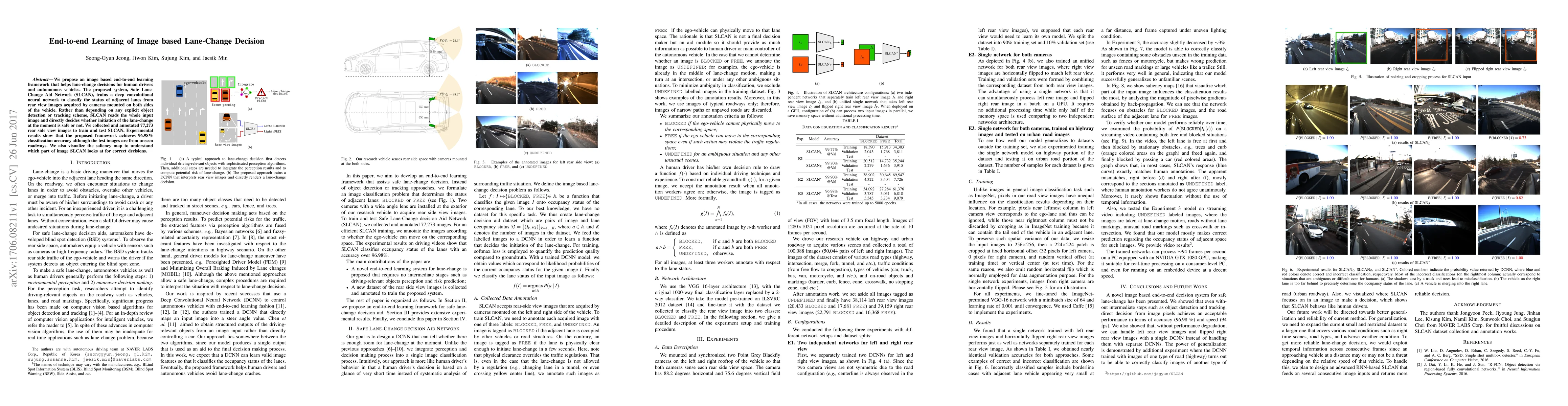 The paper proposes the Safe Lane-Change Aid Network (SLCAN), an end-to-end learning framework using deep convolutional neural networks to classify the safety of lane-change decisions from rear view images. The system achieves 96.98% accuracy without relying on object detection or tracking, and visualizes saliency maps to identify critical image regions for decision-making.