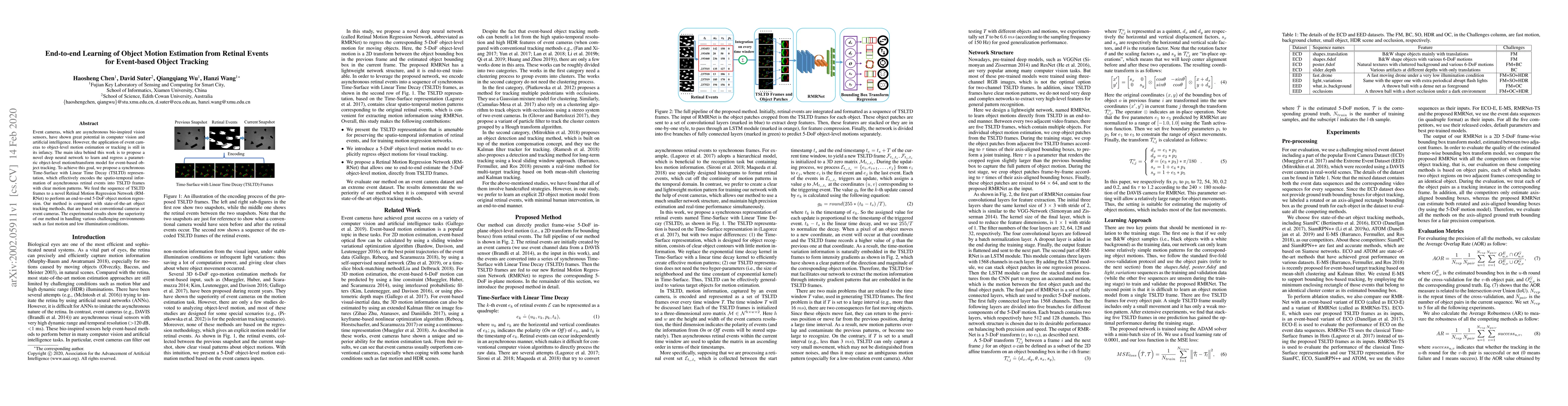 This paper proposes a deep neural network to estimate object motion from event camera data for tracking. It introduces a TSLTD representation to encode retinal events and an RMRNet to perform end-to-end 5-DoF motion regression, demonstrating superior performance in challenging conditions compared to state-of-the-art methods.