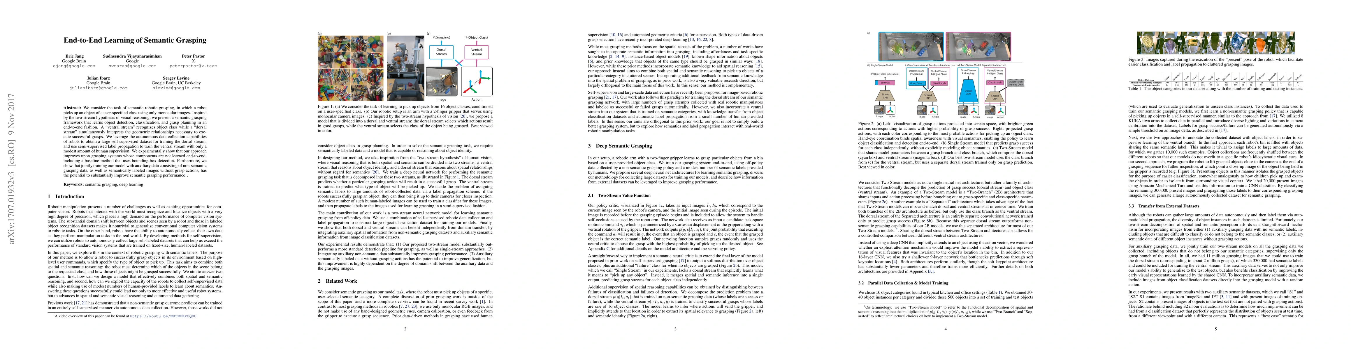 This paper presents an end-to-end learning framework for semantic robotic grasping, combining object detection and classification with grasp planning. It uses a dual-stream approach, with one stream recognizing object classes and another interpreting geometric relationships for grasp execution, achieving better performance than non-end-to-end methods.