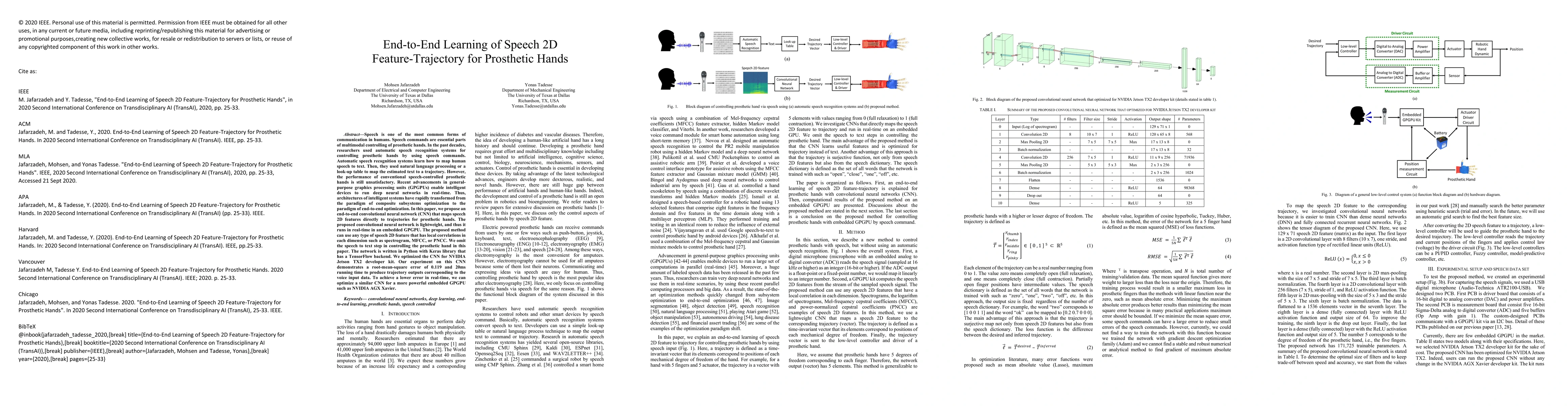 Speech is one of the most common forms of communication in humans. Speech commands are essential parts of multimodal controlling of prosthetic hands. In the past decades, researchers used automatic speech recognition systems for controlling prosthetic hands by using speech commands. Automatic speech recognition systems learn how to map human speech to text. Then, they used natural language processing or a look-up table to map the estimated text to a trajectory. However, the performance of conventional speech-controlled prosthetic hands is still unsatisfactory. Recent advancements in general-purpose graphics processing units (GPGPUs) enable intelligent devices to run deep neural networks in real-time. Thus, architectures of intelligent systems have rapidly transformed from the paradigm of composite subsystems optimization to the paradigm of end-to-end optimization. In this paper, we propose an end-to-end convolutional neural network (CNN) that maps speech 2D features directly to trajectories for prosthetic hands. The proposed convolutional neural network is lightweight, and thus it runs in real-time in an embedded GPGPU. The proposed method can use any type of speech 2D feature that has local correlations in each dimension such as spectrogram, MFCC, or PNCC. We omit the speech to text step in controlling the prosthetic hand in this paper. The network is written in Python with Keras library that has a TensorFlow backend. We optimized the CNN for NVIDIA Jetson TX2 developer kit. Our experiment on this CNN demonstrates a root-mean-square error of 0.119 and 20ms running time to produce trajectory outputs corresponding to the voice input data. To achieve a lower error in real-time, we can optimize a similar CNN for a more powerful embedded GPGPU such as NVIDIA AGX Xavier.