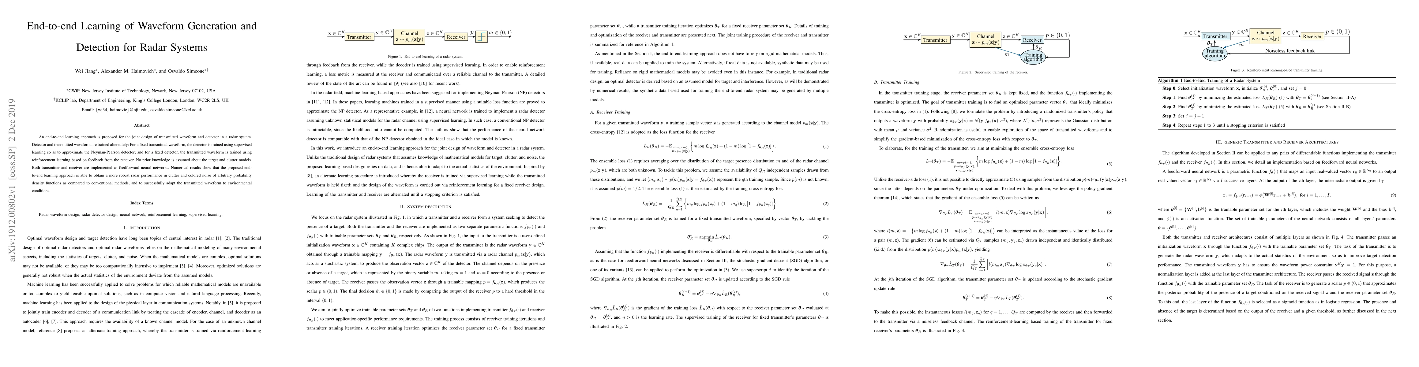 This paper proposes an end-to-end learning method for jointly designing radar waveforms and detectors, utilizing neural networks for both. The approach alternates between supervised learning for the detector and reinforcement learning for the waveform, achieving robust performance in varied noise conditions.