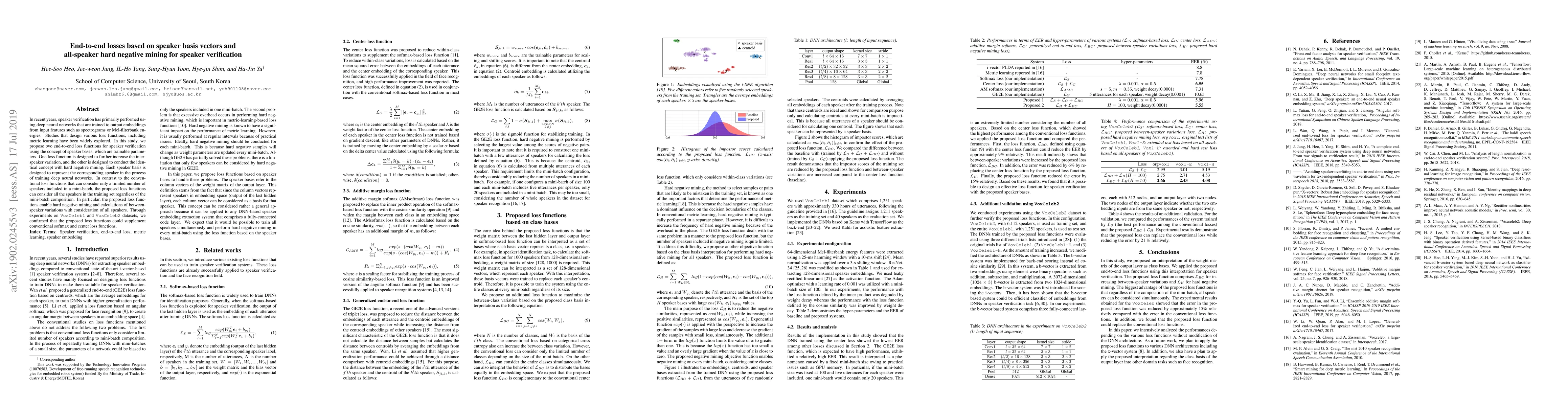 This paper proposes two novel end-to-end loss functions for speaker verification using speaker basis vectors and all-speaker hard negative mining, which enhance inter-speaker variation and consider all speakers in training. Experiments on VoxCeleb1 and VoxCeleb2 datasets show improved performance over conventional loss functions.