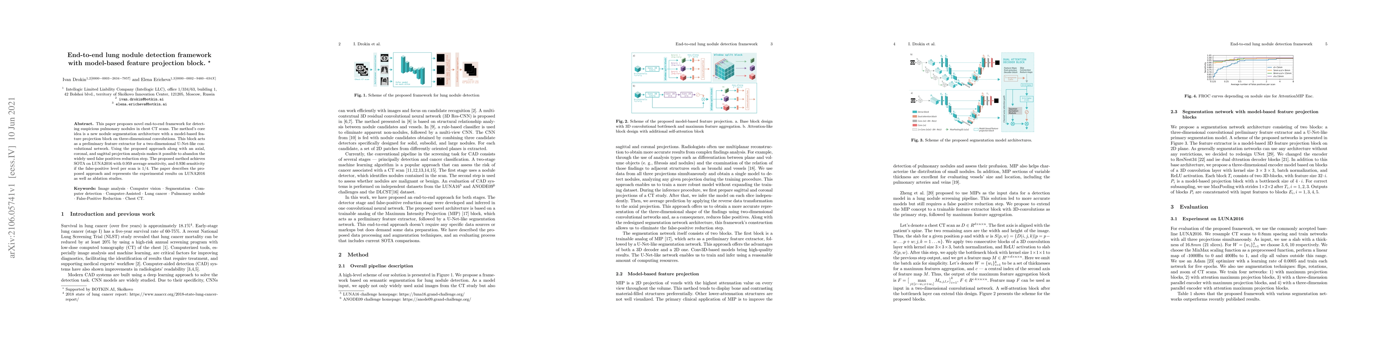 This paper introduces a novel end-to-end framework for detecting pulmonary nodules in chest CT scans using a model-based feature projection block within a 3D convolutional architecture. The method achieves state-of-the-art results on LUNA2016, eliminating the need for traditional false positives reduction steps.