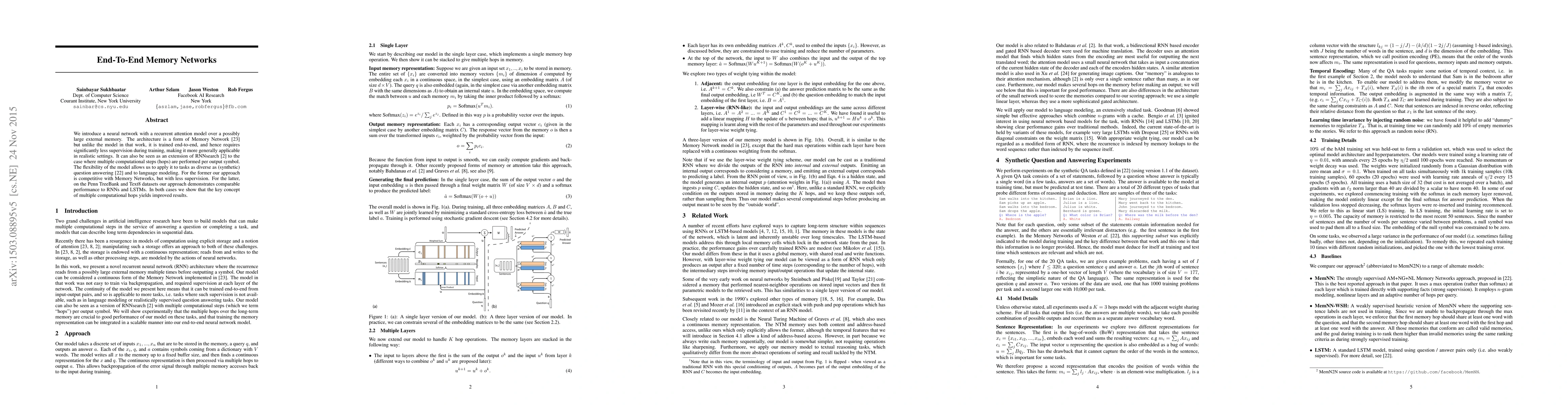 This paper presents an end-to-end trained neural network with a recurrent attention model over an external memory, extending Memory Networks with fewer training supervision requirements. The model achieves competitive results in question answering and language modeling tasks, demonstrating improved performance through multiple computational hops.