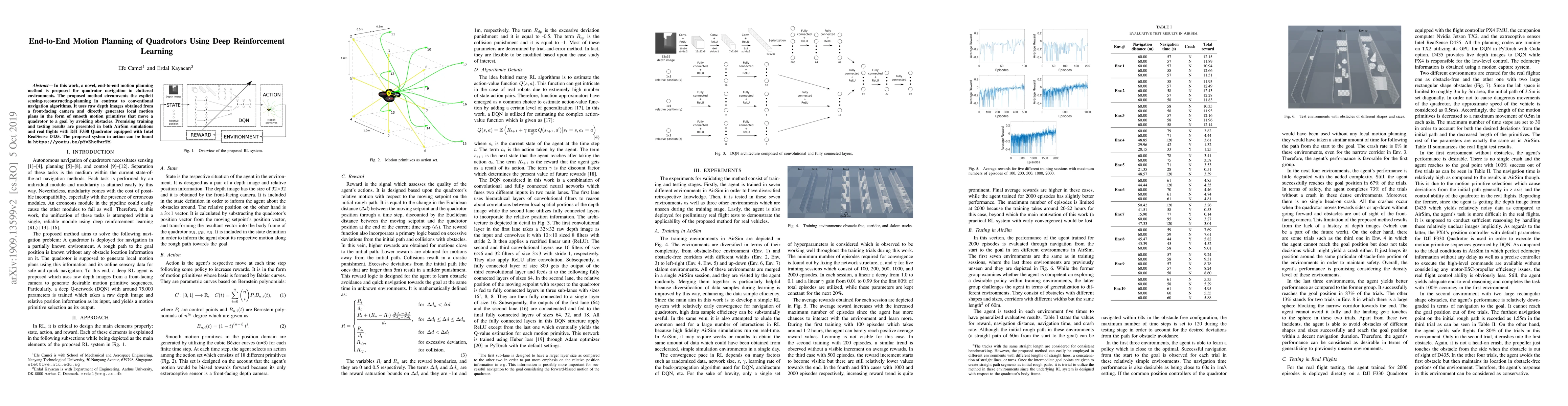 This paper proposes an end-to-end motion planning method for quadrotors using deep reinforcement learning, directly generating local motion plans from raw depth images to navigate cluttered environments. The method is validated through simulations and real flights, demonstrating effective obstacle avoidance and goal-reaching.