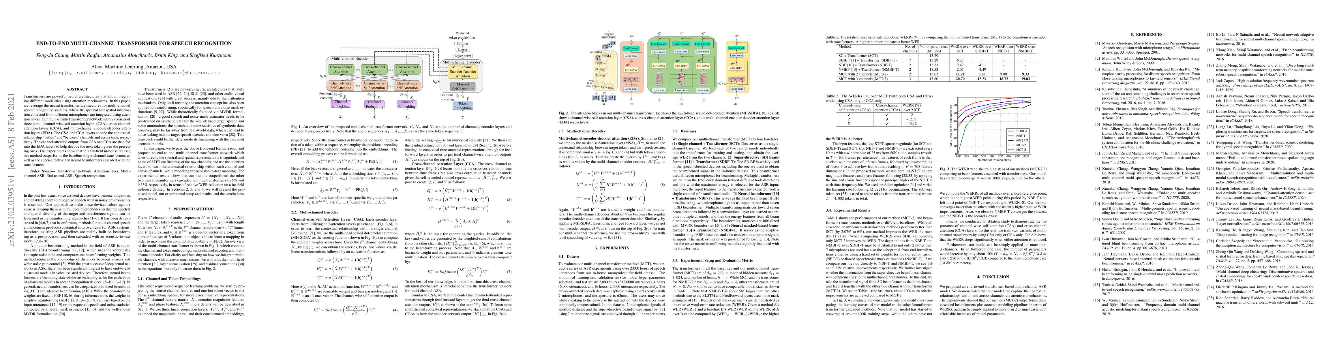 This paper proposes a multi-channel transformer for speech recognition that integrates spectral and spatial information from different microphones using attention mechanisms. The model outperforms baseline single-channel transformers and other methods on a far-field in-house dataset.