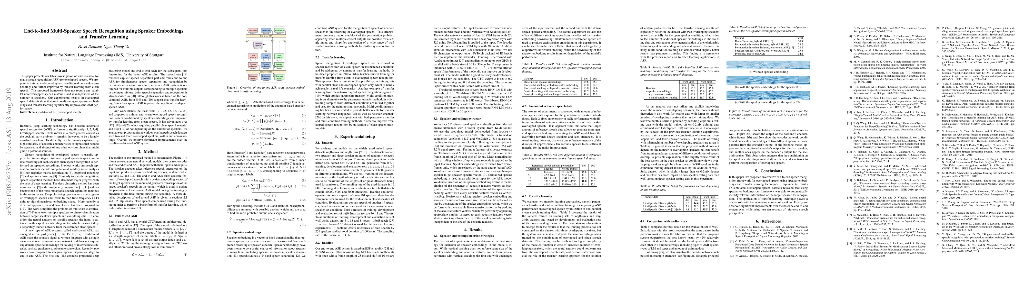 This paper proposes an end-to-end ASR system for overlapped speech using speaker embeddings and transfer learning, achieving improved performance without requiring parallel non-overlapped speech data. Experimental results demonstrate significant enhancements in recognition accuracy.