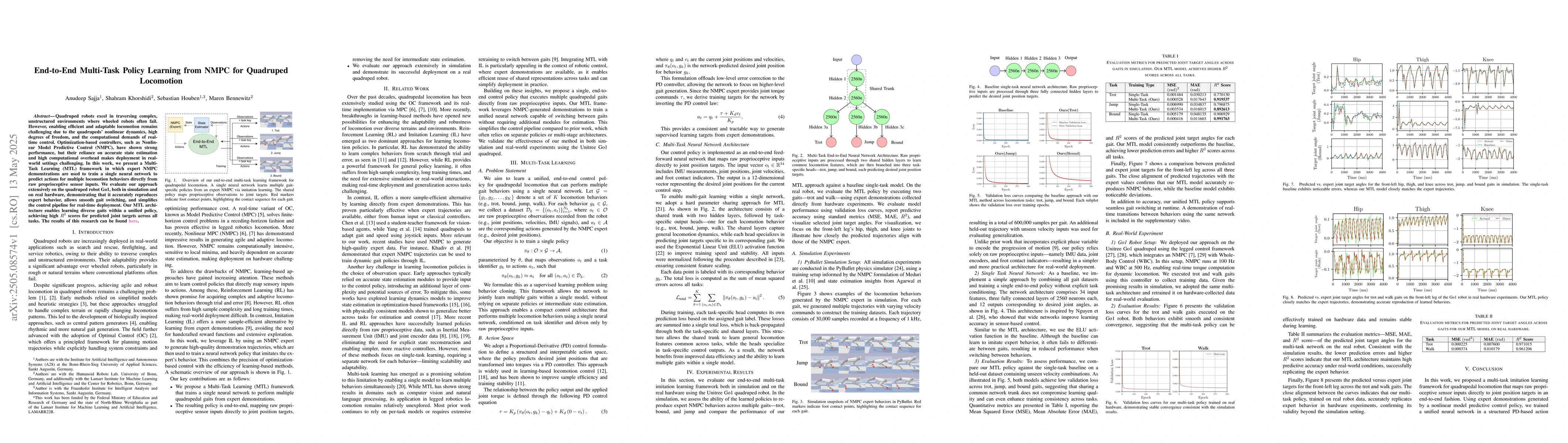The research presents a Multi-Task Learning (MTL) framework that trains a single neural network using expert NMPC demonstrations to predict actions for multiple locomotion behaviors directly from raw proprioceptive sensor inputs on the quadruped robot Go1, both in simulation and on real hardware.