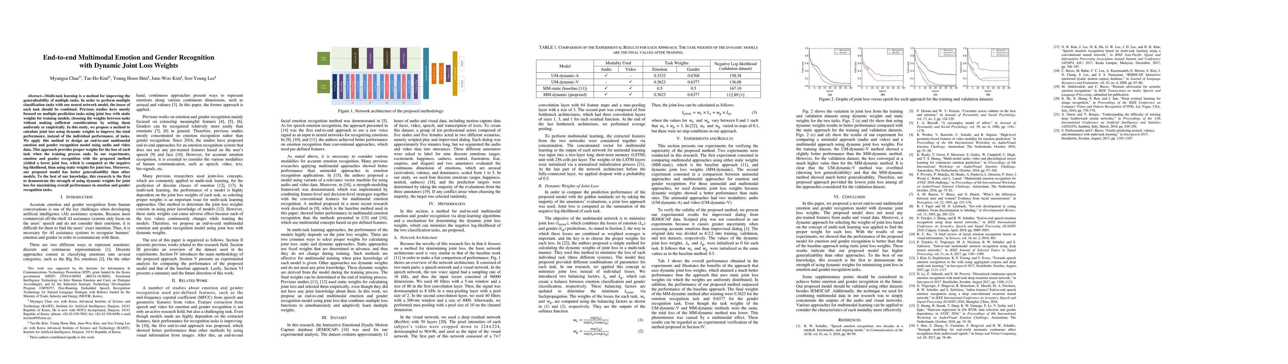 This paper proposes a novel method for multimodal emotion and gender recognition using dynamic joint loss weights to improve overall task performance rather than individual task performance. The dynamic weighting approach enhances the generalizability of the model compared to static weighting methods, achieving lower joint loss and better results in experiments.