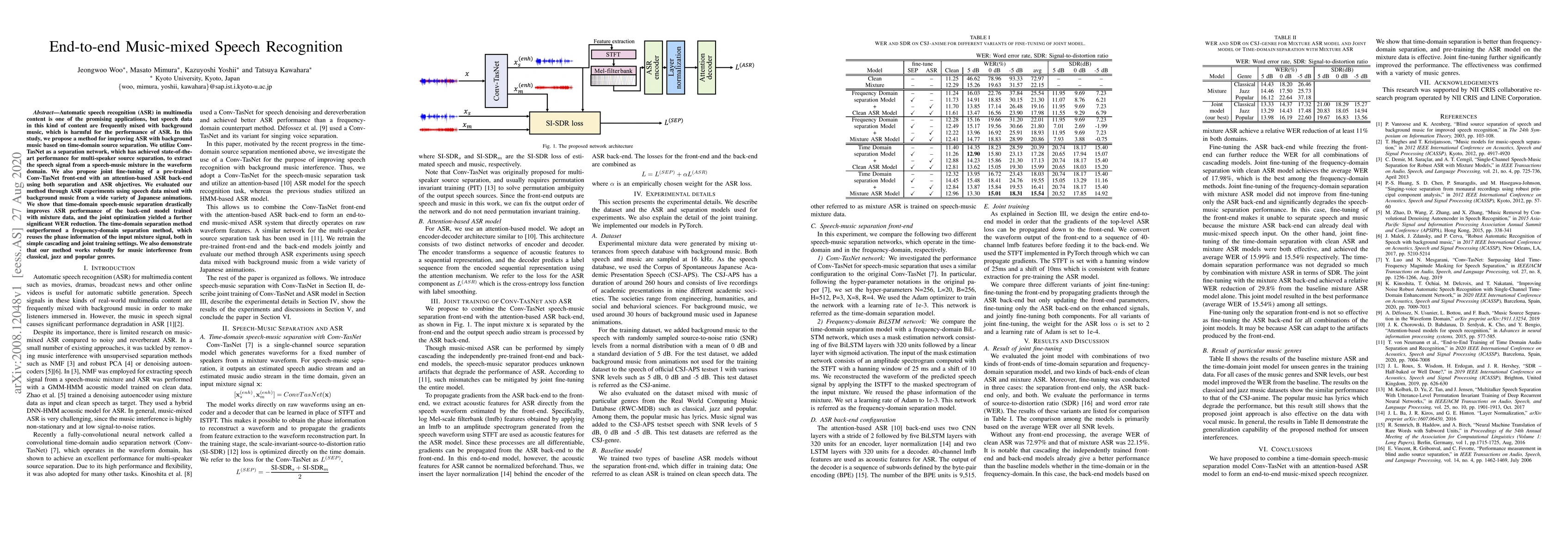 This paper proposes an end-to-end method for improving automatic speech recognition (ASR) in music-mixed speech using time-domain source separation with Conv-TasNet, showing significant WER reduction through joint optimization with an attention-based ASR model. The time-domain separation method outperforms frequency-domain methods and works robustly across various music genres.