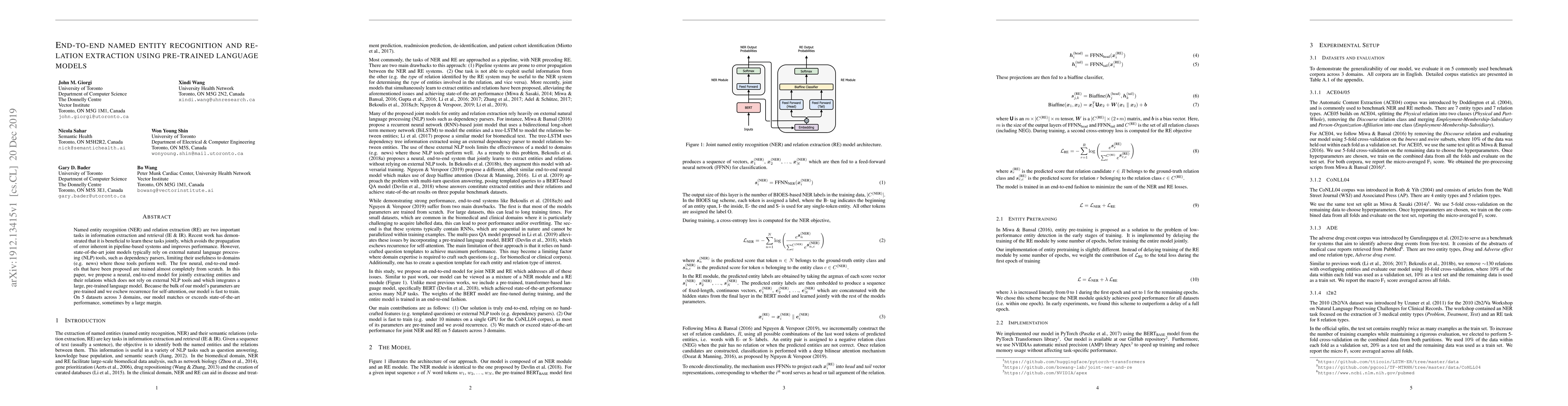 This paper proposes an end-to-end neural model for joint named entity recognition and relation extraction that leverages a pre-trained language model, avoiding reliance on external NLP tools and achieving competitive performance across multiple datasets.
