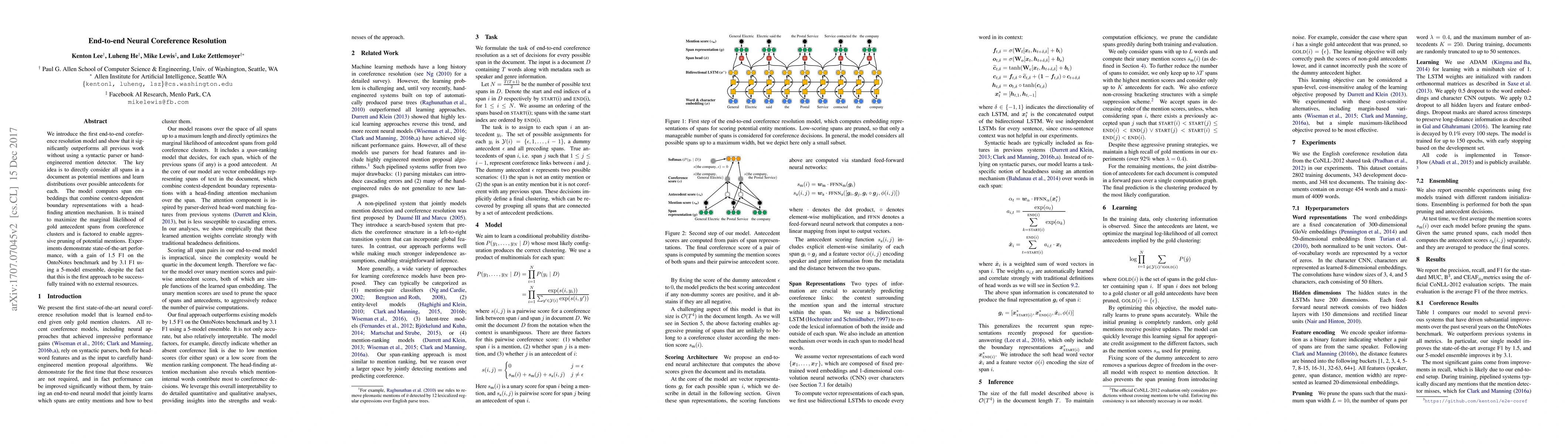 The paper introduces an end-to-end neural coreference resolution model that outperforms previous work without using a syntactic parser or hand-engineered mention detector. It directly considers all spans in a document as potential mentions, learning distributions over possible antecedents for each, and computes span embeddings combining context-dependent boundary representations with a head-finding attention mechanism.