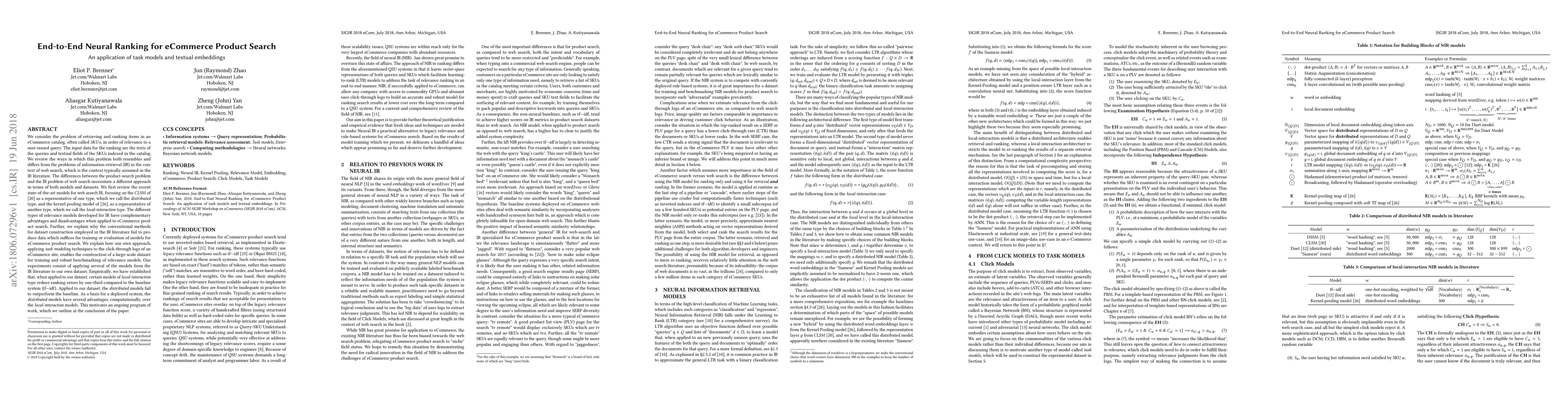 We consider the problem of retrieving and ranking items in an eCommerce catalog, often called SKUs, in order of relevance to a user-issued query. The input data for the ranking are the texts of the queries and textual fields of the SKUs indexed in the catalog. We review the ways in which this problem both resembles and differs from the problems of IR in the context of web search. The differences between the product-search problem and the IR problem of web search necessitate a different approach in terms of both models and datasets. We first review the recent state-of-the-art models for web search IR, distinguishing between two distinct types of model which we call the distributed type and the local-interaction type. The different types of relevance models developed for IR have complementary advantages and disadvantages when applied to eCommerce product search. Further, we explain why the conventional methods for dataset construction employed in the IR literature fail to produce data which suffices for training or evaluation of models for eCommerce product search. We explain how our own approach, applying task modeling techniques to the click-through logs of an eCommerce site, enables the construction of a large-scale dataset for training and robust benchmarking of relevance models. Our experiments consist of applying several of the models from the IR literature to our own dataset. Empirically, we have established that, when applied to our dataset, certain models of local-interaction type reduce ranking errors by one-third compared to the baseline tf-idf. Applied to our dataset, the distributed models fail to outperform the baseline. As a basis for a deployed system, the distributed models have several advantages, computationally, over the local-interaction models. This motivates an ongoing program of work, which we outline at the conclusion of the paper.