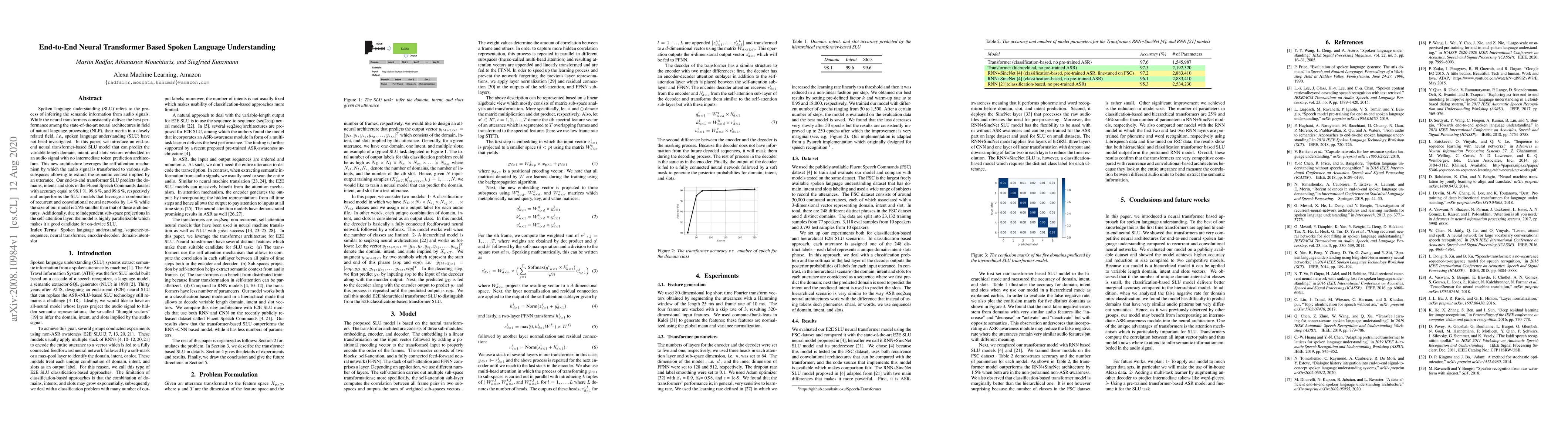 This paper introduces an end-to-end neural transformer-based model for spoken language understanding (SLU), achieving high accuracy without intermediate token predictions. It outperforms traditional models while being smaller and more parallelizable.