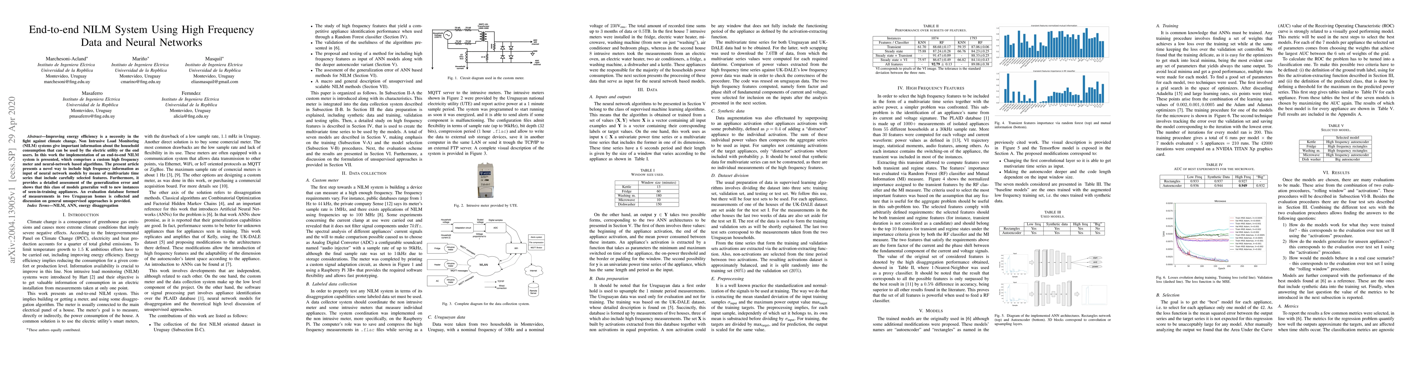 Improving energy efficiency is a necessity in the fight against climate change. Non Intrusive Load Monitoring (NILM) systems give important information about the household consumption that can be used by the electric utility or the end users. In this work the implementation of an end-to-end NILM system is presented, which comprises a custom high frequency meter and neural-network based algorithms. The present article presents a novel way to include high frequency information as input of neural network models by means of multivariate time series that include carefully selected features. Furthermore, it provides a detailed assessment of the generalization error and shows that this class of models generalize well to new instances of seen-in-training appliances. An evaluation database formed of measurements in two Uruguayan homes is collected and discussion on general unsupervised approaches is provided.