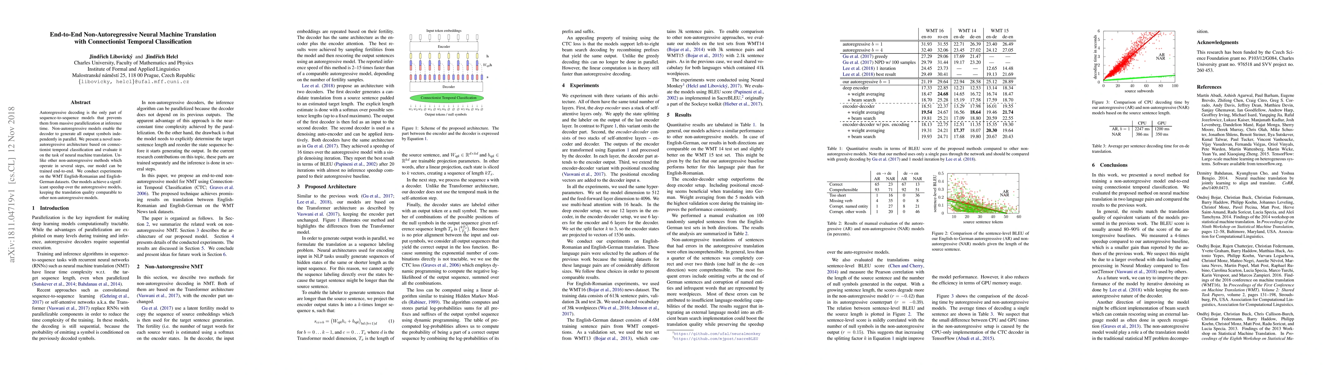 This paper proposes a novel end-to-end non-autoregressive neural machine translation model using connectionist temporal classification, achieving significant speedups compared to autoregressive models while maintaining comparable translation quality. Experiments on WMT English-Romanian and English-German datasets validate the effectiveness of the approach.