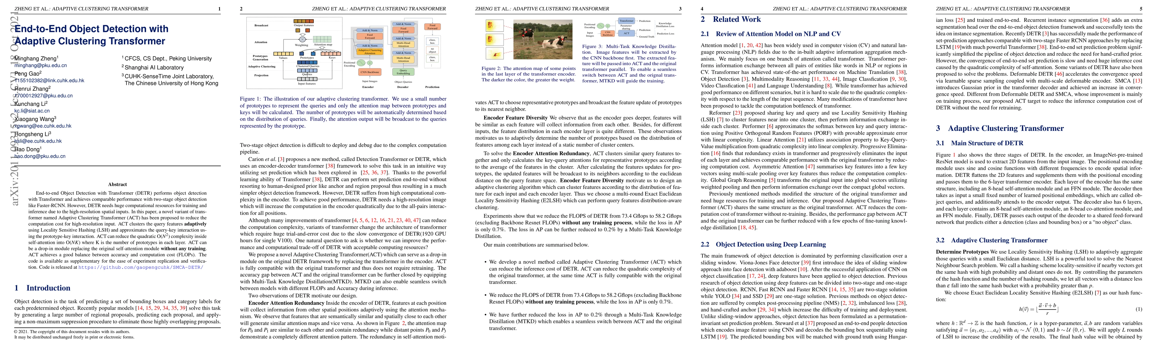 This paper introduces the Adaptive Clustering Transformer (ACT) to enhance DETR's efficiency for high-resolution object detection. ACT reduces computational cost by clustering query features and approximating query-key interactions, transforming the quadratic complexity of self-attention into linear complexity relative to the number of prototypes.