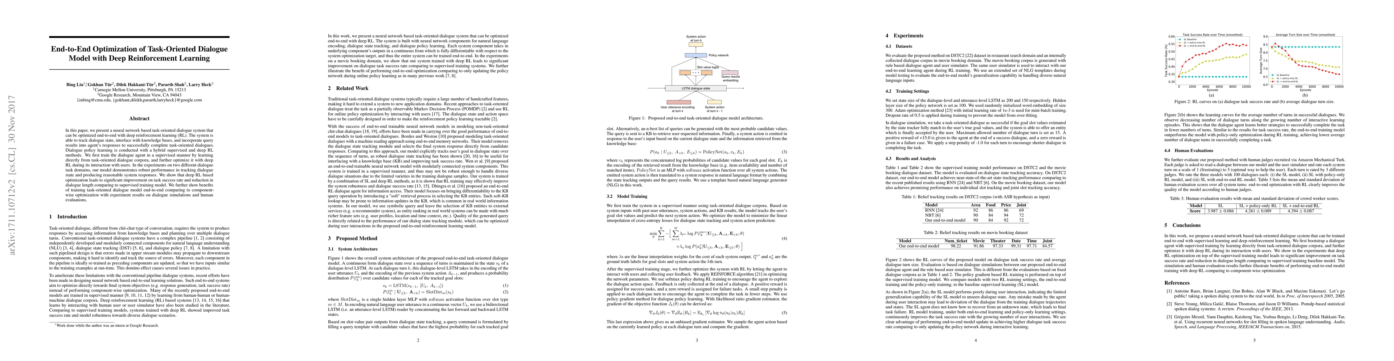 This research introduces a neural network-based task-oriented dialogue system optimized through deep reinforcement learning, demonstrating enhanced performance in task completion and dialogue efficiency compared to supervised training alone. End-to-end optimization with deep RL significantly boosts task success rates and shortens dialogue length.