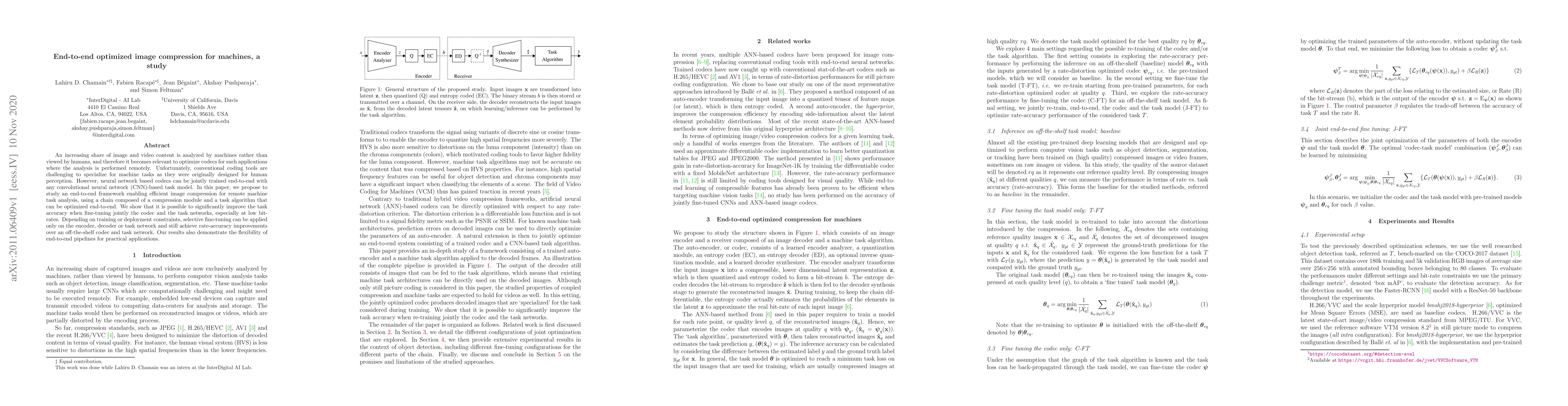 This paper proposes an end-to-end framework for optimizing image compression specifically for machine analysis, achieving significant improvements in task accuracy through joint training of the compression codec and task networks, especially at low bit-rates. The study highlights the flexibility of this approach for practical applications, demonstrating that selective fine-tuning can yield rate-accuracy improvements over conventional methods.