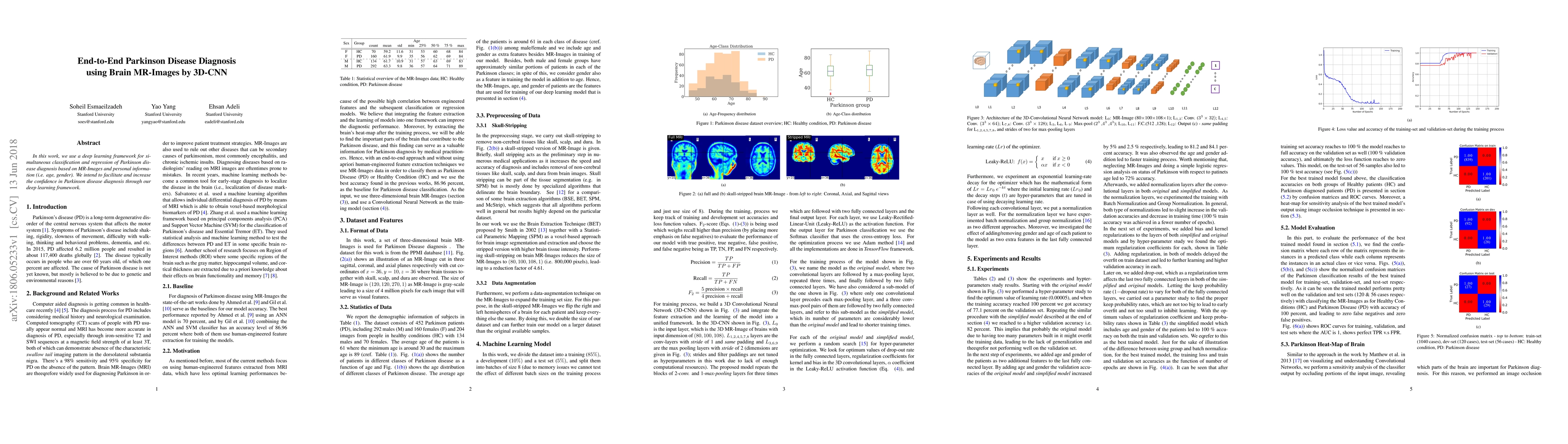 In this work, we use a deep learning framework for simultaneous classification and regression of Parkinson disease diagnosis based on MR-Images and personal information (i.e. age, gender). We intend to facilitate and increase the confidence in Parkinson disease diagnosis through our deep learning framework.