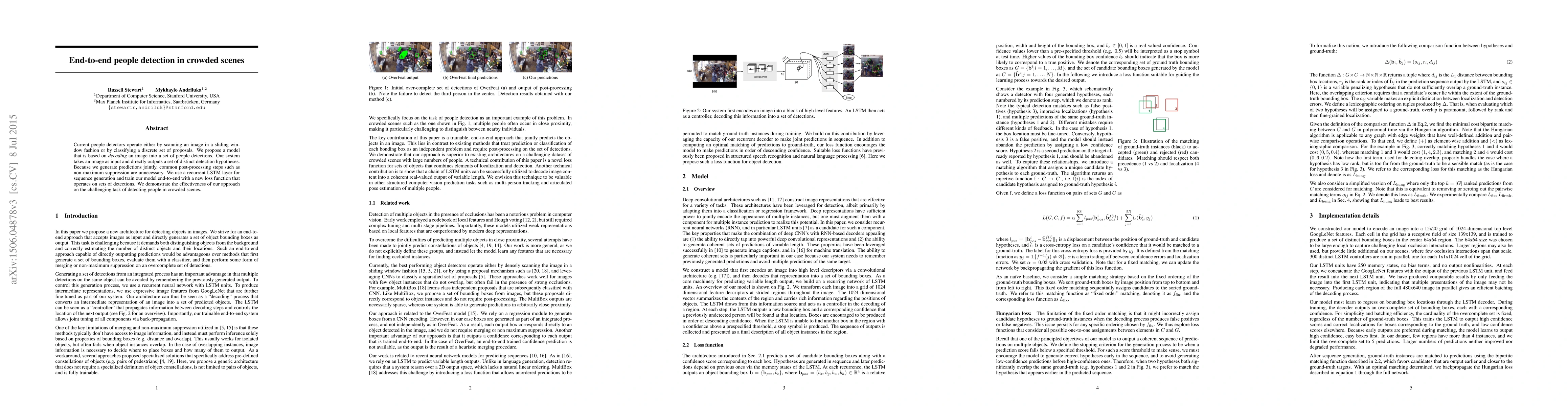This paper proposes an end-to-end model for detecting people in crowded scenes using a recurrent LSTM layer for sequence generation, eliminating the need for non-maximum suppression through joint prediction. The model is trained with a new loss function designed for sets of detections.