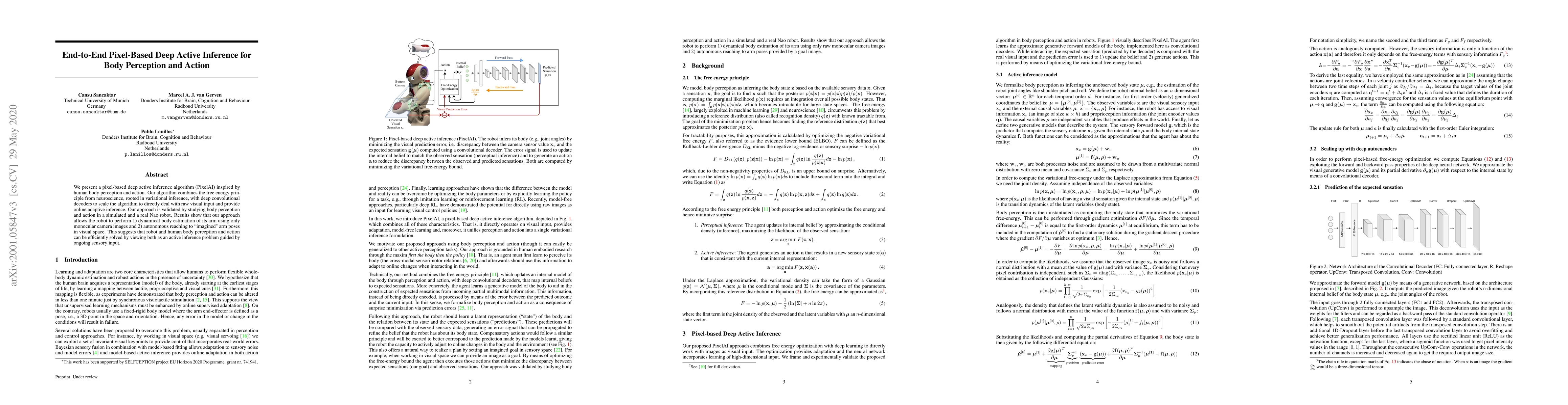 This paper introduces PixelAI, a deep active inference algorithm that combines neuroscience's free-energy principle with deep convolutional decoders for pixel-based body perception and action. The algorithm enables a Nao robot to dynamically estimate its arm from monocular images and autonomously reach imagined arm poses, demonstrating the potential of active inference in both human and robotic body perception.
