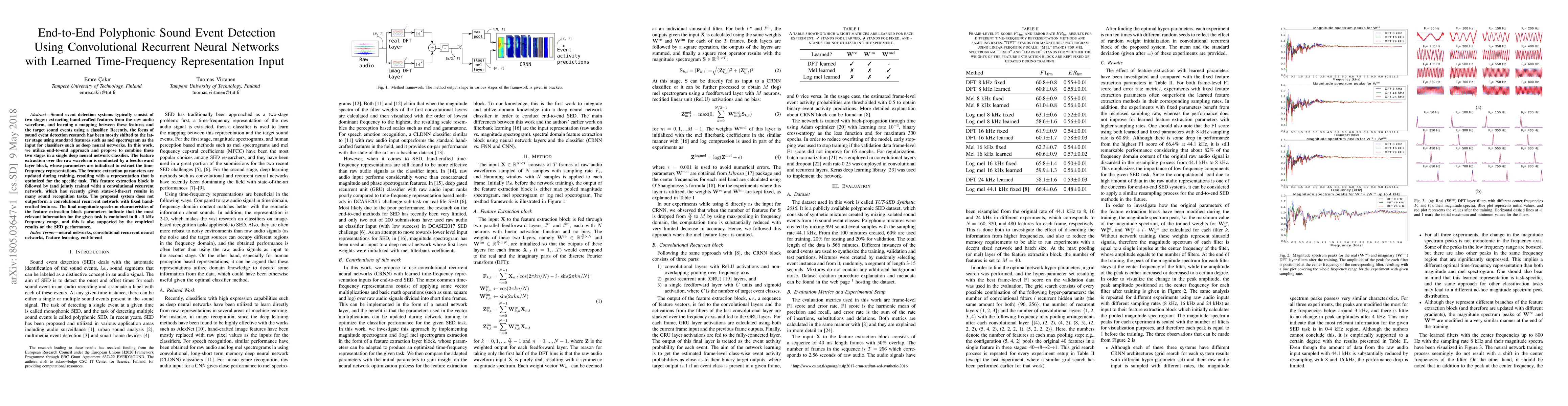 This paper proposes an end-to-end polyphonic sound event detection system using a convolutional recurrent neural network with a learned time-frequency representation input. The system combines feature extraction and classification in a single deep neural network, optimizing feature extraction parameters during training for better sound event detection.