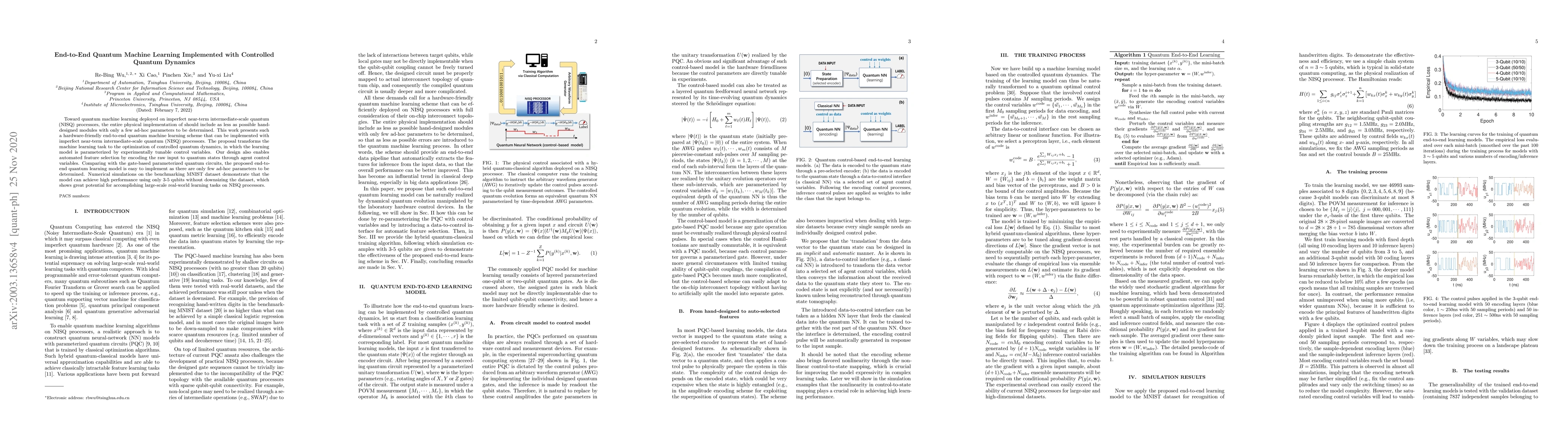 This paper proposes an end-to-end quantum machine learning scheme that minimizes hand-designed modules for implementation on near-term intermediate-scale quantum processors. The model optimizes controlled quantum dynamics with few tunable parameters, enabling automated feature selection and achieving high performance on the MNIST dataset using just 3-5 qubits.