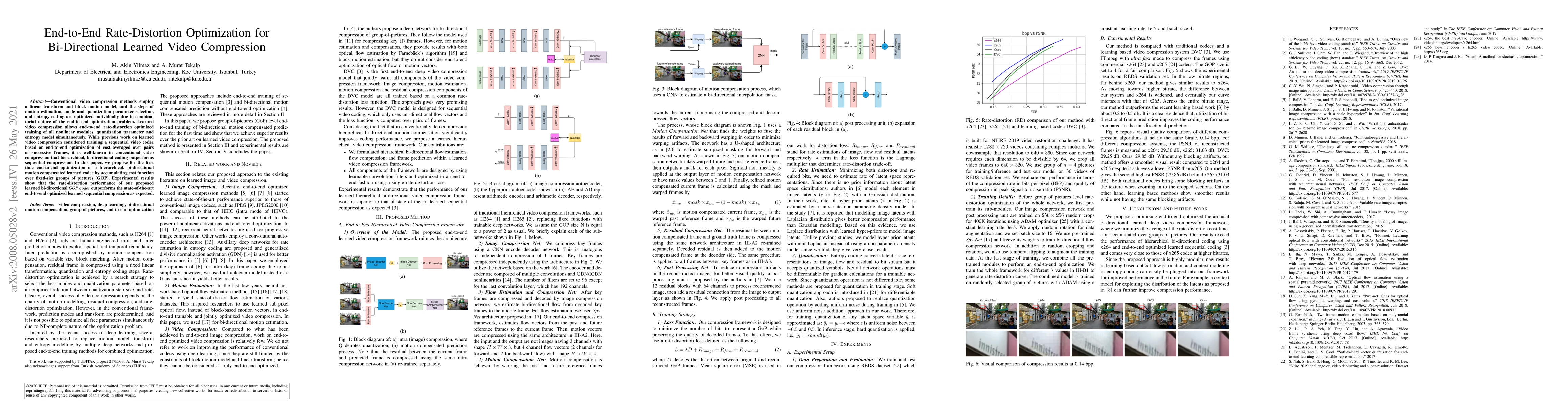 This paper proposes an end-to-end rate-distortion optimization for a hierarchical, bi-directional learned video compression codec, outperforming state-of-the-art sequential compression by optimizing over fixed-size groups of pictures (GOP). The method achieves better performance due to the bi-directional coding approach.