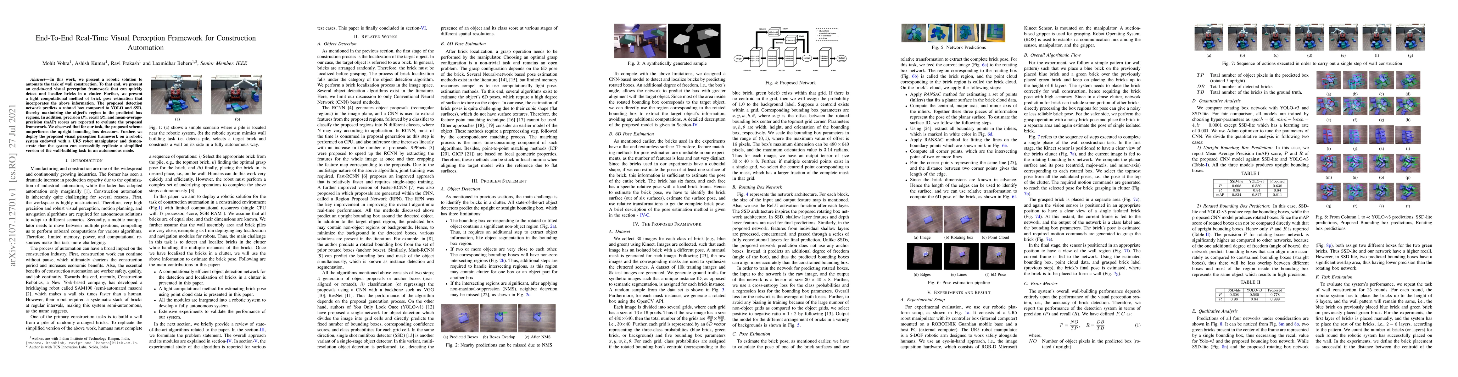 In this work, we present a robotic solution to automate the task of wall construction. To that end, we present an end-to-end visual perception framework that can quickly detect and localize bricks in a clutter. Further, we present a light computational method of brick pose estimation that incorporates the above information. The proposed detection network predicts a rotated box compared to YOLO and SSD, thereby maximizing the object's region in the predicted box regions. In addition, precision P, recall R, and mean-average-precision (mAP) scores are reported to evaluate the proposed framework. We observed that for our task, the proposed scheme outperforms the upright bounding box detectors. Further, we deploy the proposed visual perception framework on a robotic system endowed with a UR5 robot manipulator and demonstrate that the system can successfully replicate a simplified version of the wall-building task in an autonomous mode.