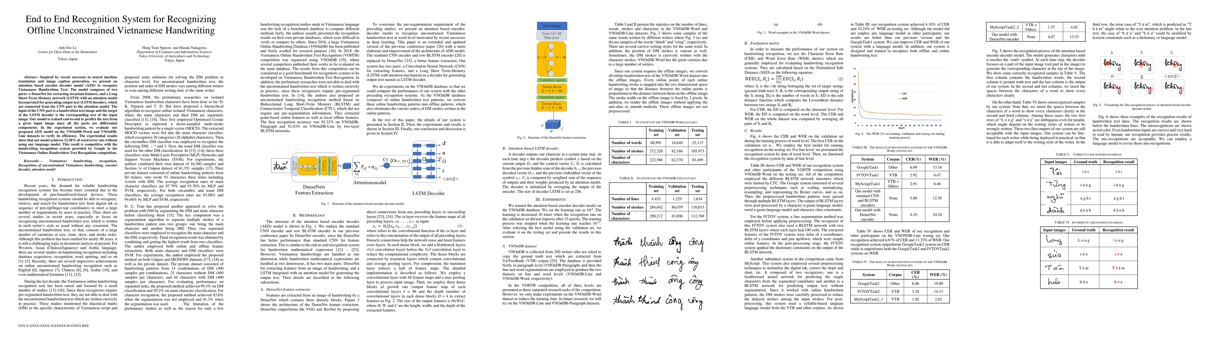This paper proposes an attention-based encoder decoder model (AED) for recognizing offline unconstrained Vietnamese handwriting, combining a DenseNet for feature extraction and an LSTM with attention for text generation. The model achieves a competitive 12.30% word error rate on VNOnDB datasets, rivaling Google's system in the Vietnamese Online Handwritten Text Recognition competition.