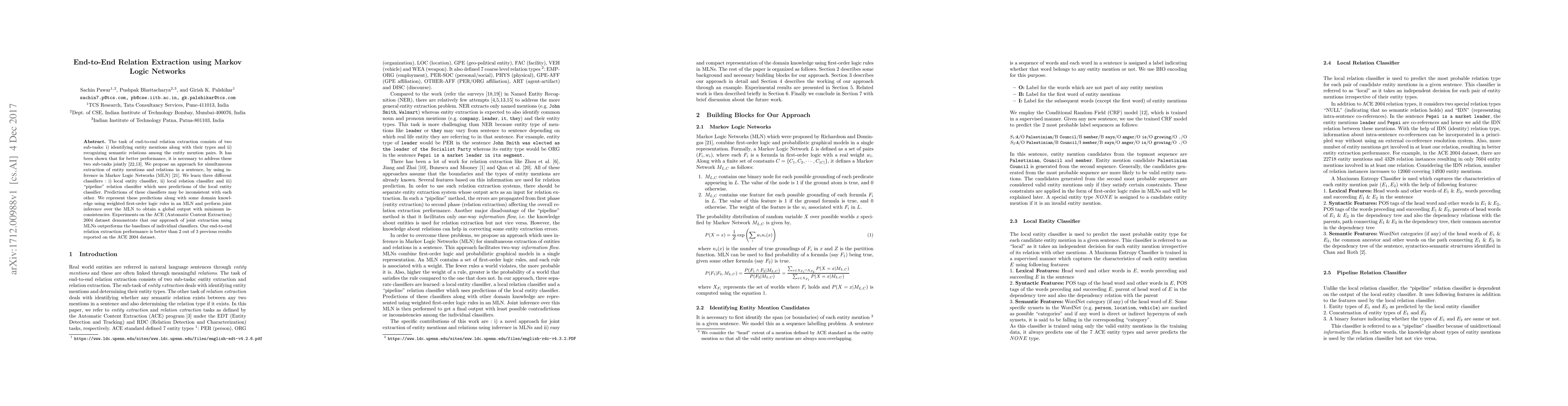 This paper proposes an end-to-end relation extraction method using Markov Logic Networks (MLN) to jointly identify entity mentions and their types, and recognize semantic relations among them. The approach outperforms individual classifiers and previous results on the ACE 2004 dataset.