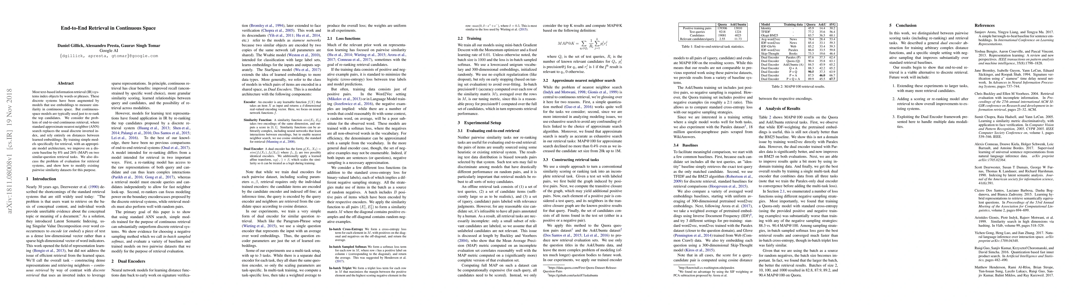 This paper proposes end-to-end retrieval in continuous space by replacing discrete indexing with approximate nearest neighbor search based on learned embeddings. The authors demonstrate significant improvements over discrete baselines by training specialized retrieval models, achieving 8% and 26% better mean average precision on two tasks.