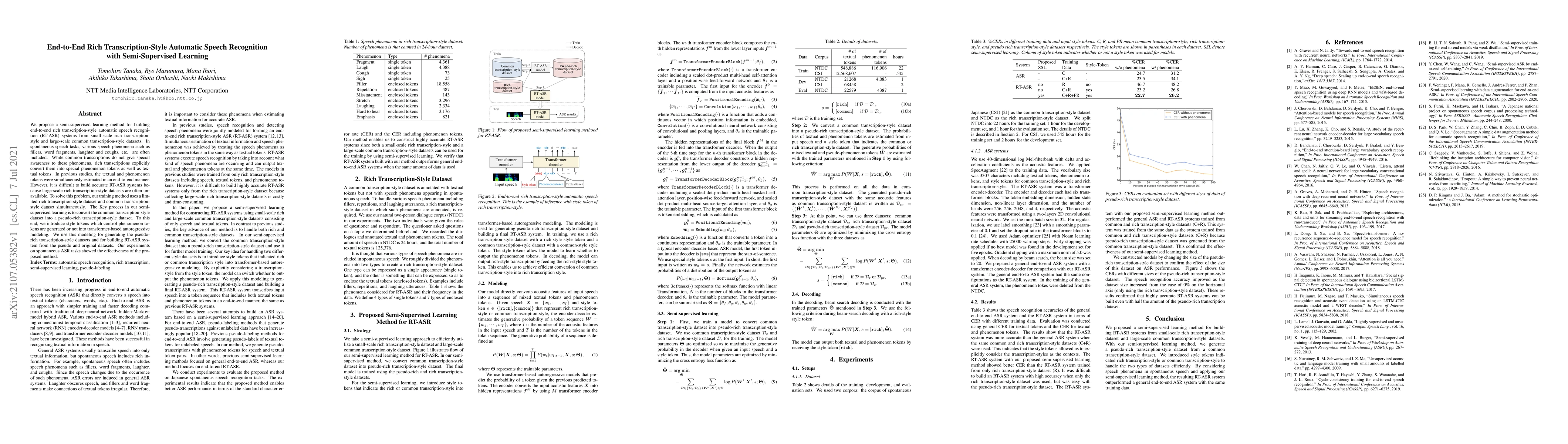 This research proposes a semi-supervised learning method for end-to-end rich transcription-style automatic speech recognition (RT-ASR) by leveraging both small-scale rich transcription and large-scale common transcription datasets. The method introduces style tokens in transformer-based modeling to generate pseudo-rich transcription datasets, facilitating the development of accurate RT-ASR systems despite limited rich transcription datasets.