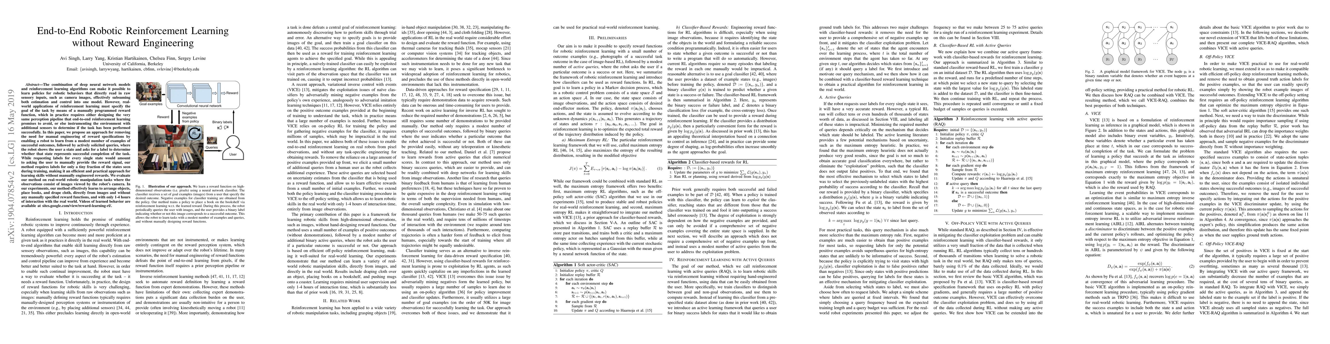 This paper proposes a method for robotic reinforcement learning that eliminates the need for manually engineered reward functions by learning from a small number of example outcomes and user-provided labels for a small fraction of states. The approach enables the robot to perform tasks like arranging objects and manipulating cloth directly from camera images without any predefined rewards.