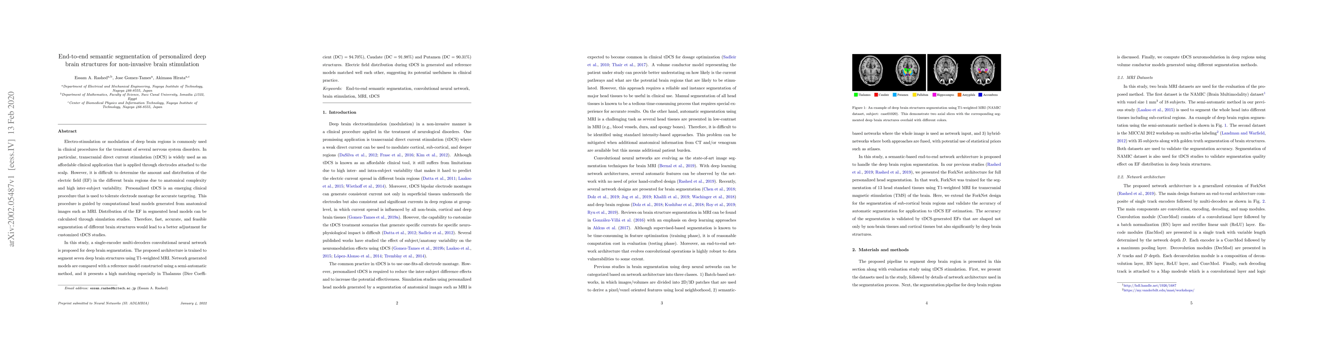 This paper proposes a convolutional neural network for segmenting seven deep brain structures from T1-weighted MRI scans, aiming to improve personalized transcranial direct current stimulation (tDCS). The network shows high accuracy in segmenting structures like the Thalamus, Caudate, and Putamen, and the electric field distribution in the generated models matches well with reference models, indicating potential clinical utility.
