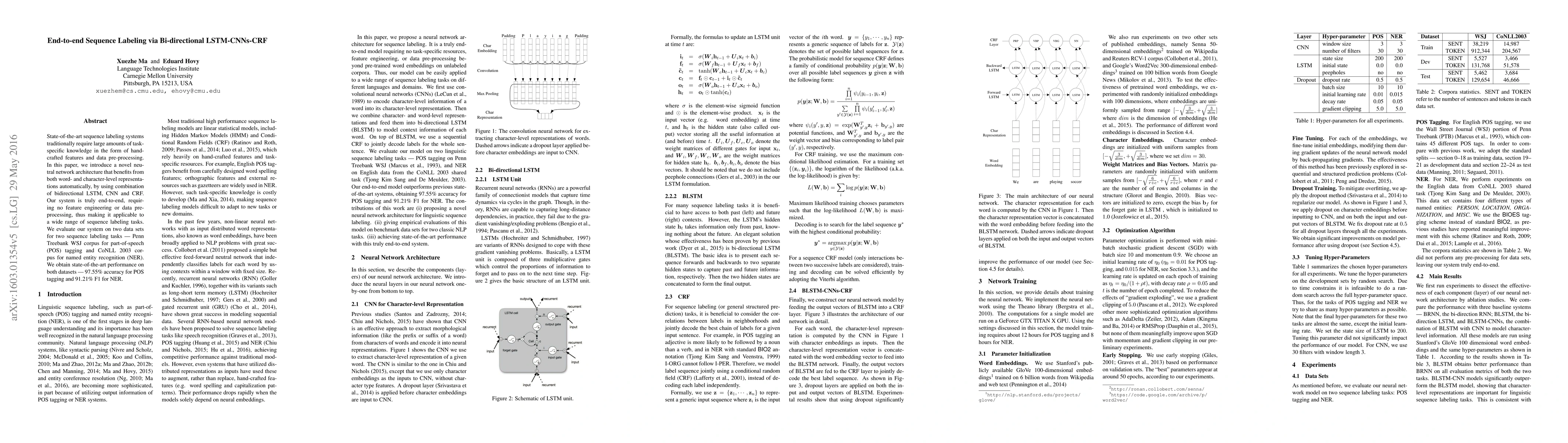 This paper proposes an end-to-end sequence labeling system using a combination of bidirectional LSTM, CNN, and CRF, eliminating the need for hand-crafted features. It achieves state-of-the-art results on POS tagging and named entity recognition tasks.