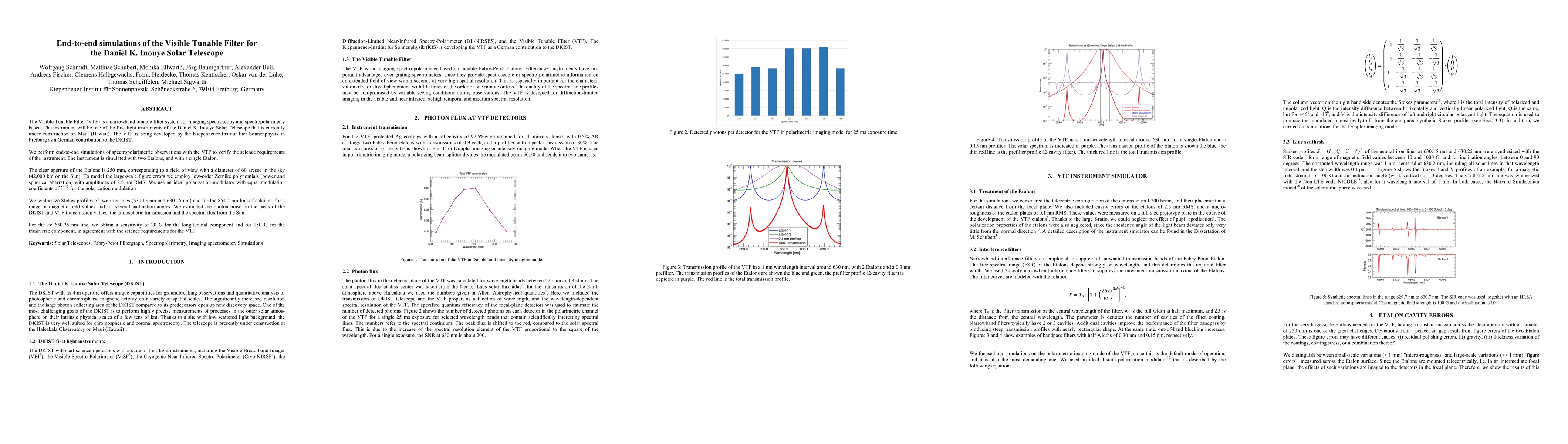The Visible Tunable Filter (VTF) is a narrowband tunable filter system for imaging spectroscopy and spectropolarimetry based. The instrument will be one of the first-light instruments of the Daniel K. Inouye Solar Telescope that is currently under construction on Maui (Hawaii). The VTF is being developed by the Kiepenheuer Institut fuer Sonnenphysik in Freiburg as a German contribution to the DKIST. We perform end-to-end simulations of spectropolarimetric observations with the VTF to verify the science requirements of the instrument. The instrument is simulated with two Etalons, and with a single Etalon. The clear aperture of the Etalons is 250 mm, corresponding to a field of view with a diameter of 60 arcsec in the sky (42,000 km on the Sun). To model the large-scale figure errors we employ low-order Zernike polynomials (power and spherical aberration) with amplitudes of 2.5 nm RMS. We use an ideal polarization modulator with equal modulation coefficients of 3-1/2 for the polarization modulation We synthesize Stokes profiles of two iron lines (630.15 nm and 630.25 nm) and for the 854.2 nm line of calcium, for a range of magnetic field values and for several inclination angles. We estimated the photon noise on the basis of the DKIST and VTF transmission values, the atmospheric transmission and the spectral flux from the Sun. For the Fe 630.25 nm line, we obtain a sensitivity of 20 G for the longitudinal component and for 150 G for the transverse component, in agreement with the science requirements for the VTF.