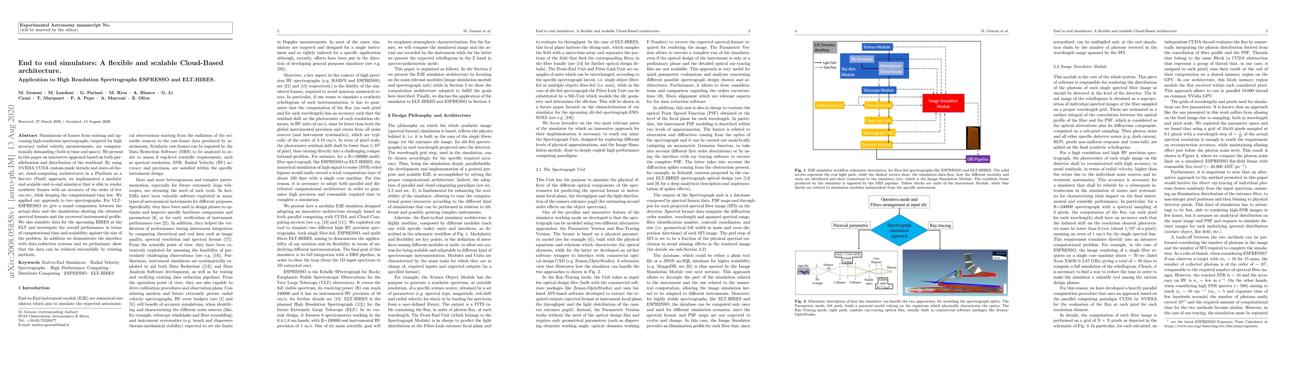 Simulations of frames from existing and upcoming high-resolution spectrographs, targeted for high accuracy radial velocity measurements, are computationally demanding (both in time and space). We present in this paper an innovative approach based on both parallelization and distribution of the workload. By using NVIDIA CUDA custom-made kernels and state-of-the-art cloud-computing architectures in a Platform as a Service (PaaS) approach, we implemented a modular and scalable end-to-end simulator that is able to render synthetic frames with an accuracy of the order of few cm/sec, while keeping the computational time low. We applied our approach to two spectrographs. For VLT-ESPRESSO we give a sound comparison between the actual data and the simulations showing the obtained spectral formats and the recovered instrumental profile. We also simulate data for the upcoming HIRES at the ELT and investigate the overall performance in terms of computational time and scalability against the size of the problem. In addition we demonstrate the interface with data-reduction systems and we preliminary show that the data can be reduced successfully by existing methods.
