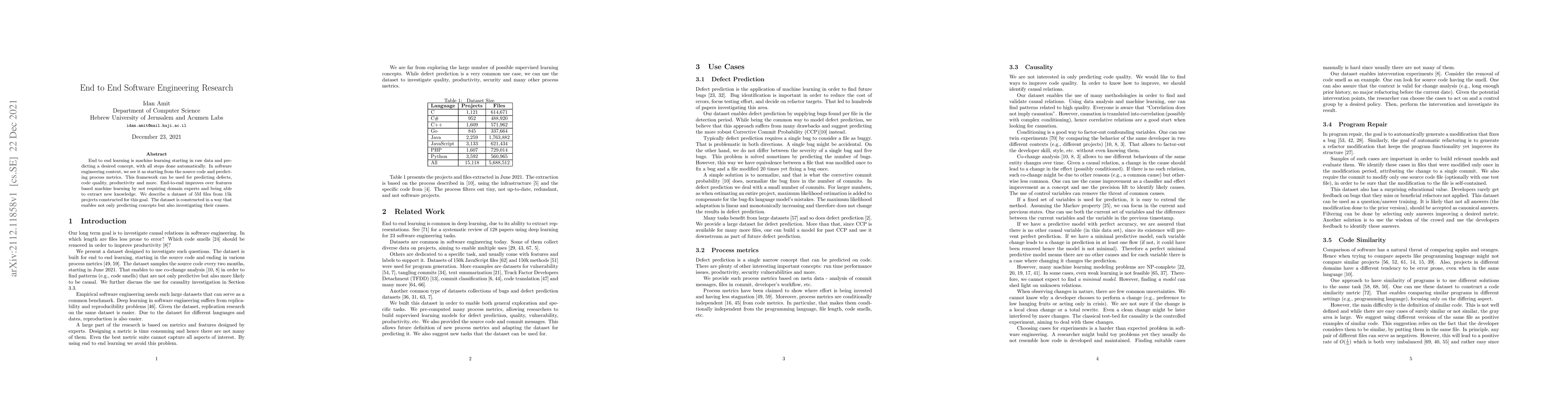 End to end learning is machine learning starting in raw data and predicting a desired concept, with all steps done automatically. In software engineering context, we see it as starting from the source code and predicting process metrics. This framework can be used for predicting defects, code quality, productivity and more. End-to-end improves over features based machine learning by not requiring domain experts and being able to extract new knowledge. We describe a dataset of 5M files from 15k projects constructed for this goal. The dataset is constructed in a way that enables not only predicting concepts but also investigating their causes.