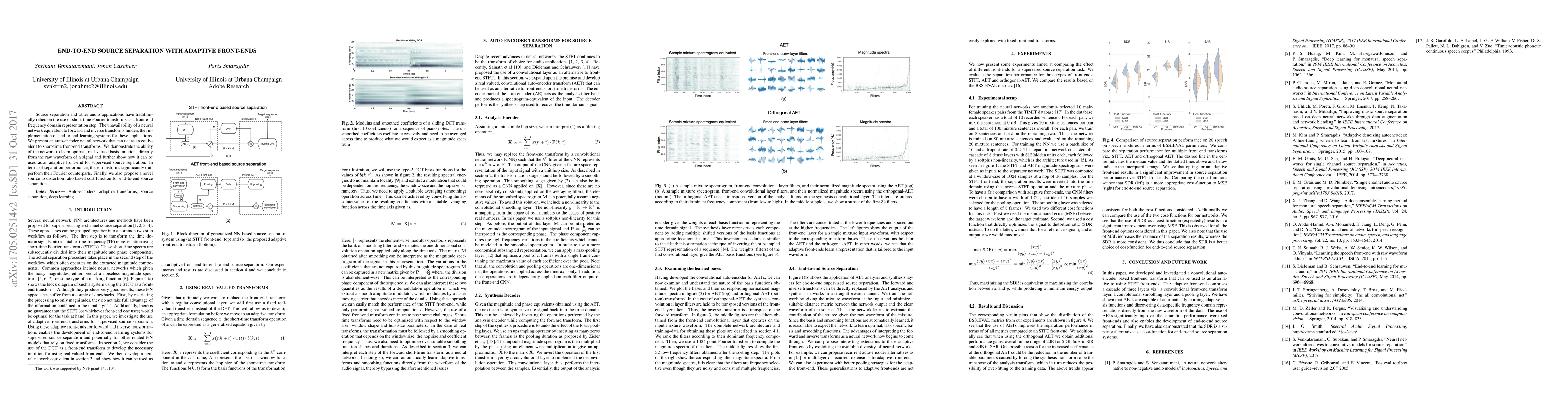 Source separation and other audio applications have traditionally relied on the use of short-time Fourier transforms as a front-end frequency domain representation step. The unavailability of a neural network equivalent to forward and inverse transforms hinders the implementation of end-to-end learning systems for these applications. We present an auto-encoder neural network that can act as an equivalent to short-time front-end transforms. We demonstrate the ability of the network to learn optimal, real-valued basis functions directly from the raw waveform of a signal and further show how it can be used as an adaptive front-end for supervised source separation. In terms of separation performance, these transforms significantly outperform their Fourier counterparts. Finally, we also propose a novel source to distortion ratio based cost function for end-to-end source separation.