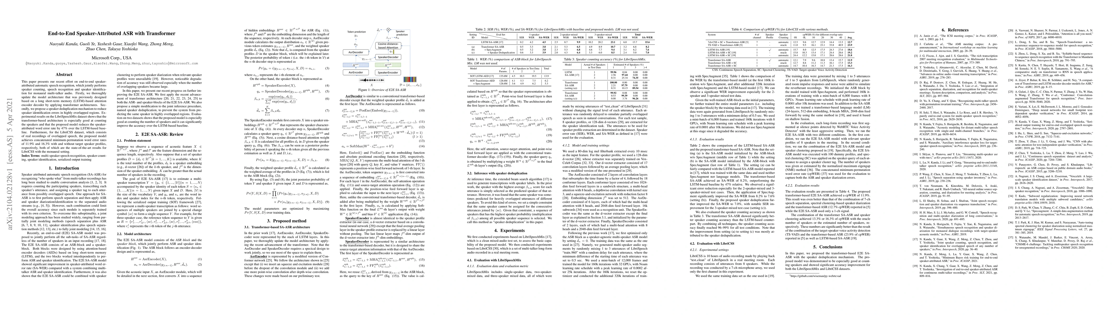 This paper updates a speaker-attributed automatic speech recognition model using transformer architectures, achieving significant improvements in speaker counting and reducing speaker-attributed word error rates by 47% compared to LSTM-based models. The proposed speaker deduplication mechanism further enhances performance in highly overlapped speech scenarios.
