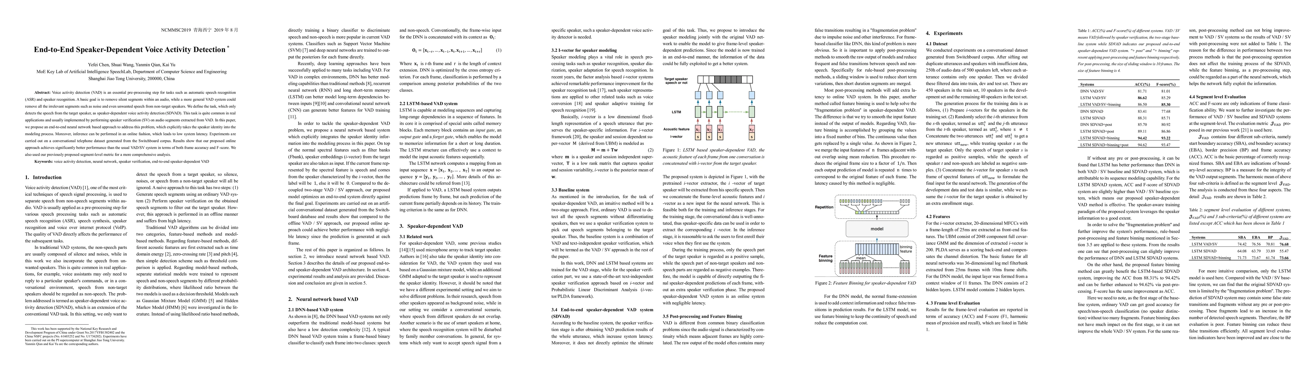 This paper proposes an end-to-end neural network for speaker-dependent voice activity detection (SDVAD), which identifies speech from the target speaker while excluding noise and non-target speech. The method achieves better performance than traditional VAD/SV systems in terms of frame accuracy and F-score, with low system latency due to online inference capability.