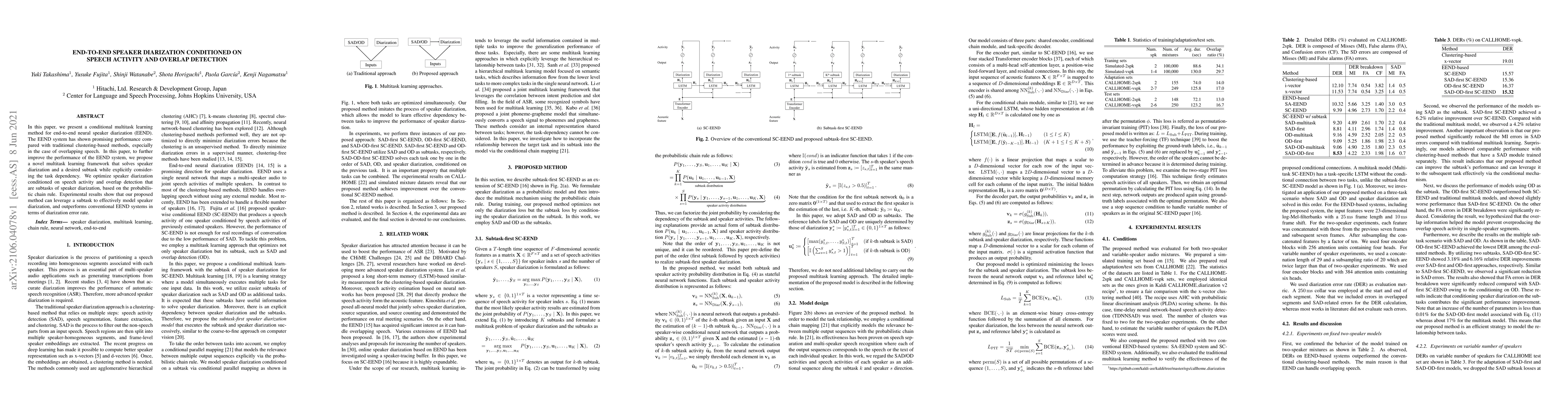 This paper introduces a conditional multitask learning method for end-to-end neural speaker diarization, optimizing it based on speech activity and overlap detection. The proposed framework outperforms traditional methods, especially in scenarios with overlapping speech, by leveraging subtasks to enhance diarization accuracy.