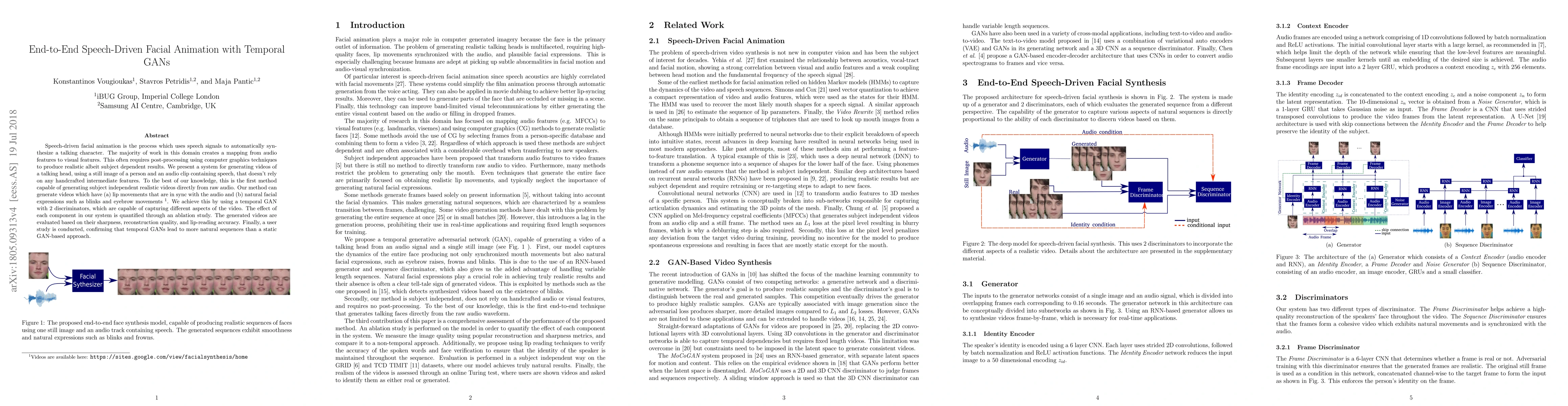 This paper introduces a novel end-to-end system for generating realistic, subject-independent talking head videos directly from raw audio using a temporal GAN with two discriminators. The method achieves synchronized lip movements and natural facial expressions without handcrafted features, validated through an ablation study and user feedback.