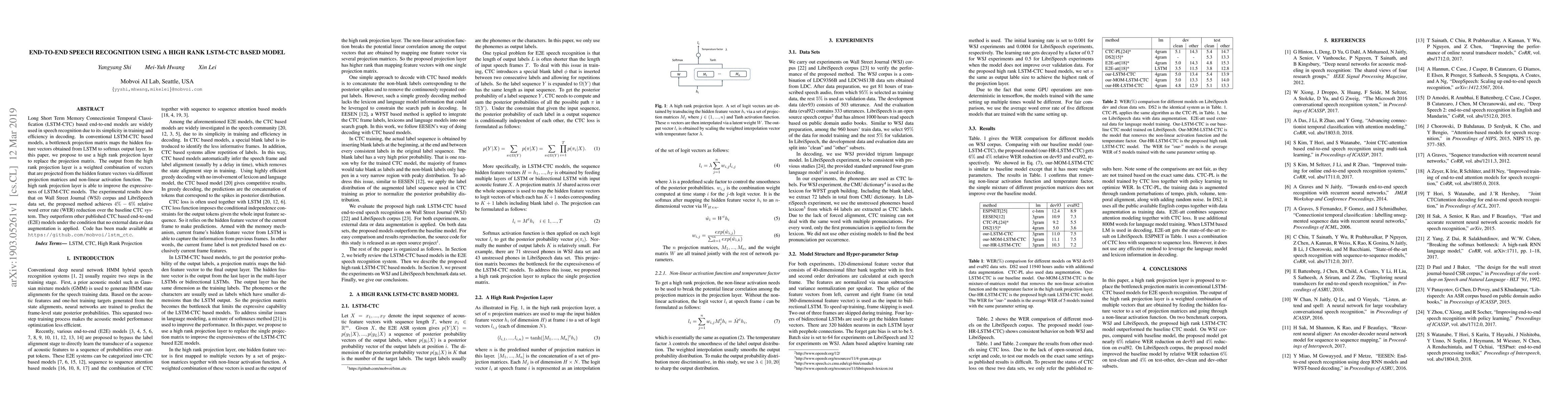 Long Short Term Memory Connectionist Temporal Classification (LSTM-CTC) based end-to-end models are widely used in speech recognition due to its simplicity in training and efficiency in decoding. In conventional LSTM-CTC based models, a bottleneck projection matrix maps the hidden feature vectors obtained from LSTM to softmax output layer. In this paper, we propose to use a high rank projection layer to replace the projection matrix. The output from the high rank projection layer is a weighted combination of vectors that are projected from the hidden feature vectors via different projection matrices and non-linear activation function. The high rank projection layer is able to improve the expressiveness of LSTM-CTC models. The experimental results show that on Wall Street Journal (WSJ) corpus and LibriSpeech data set, the proposed method achieves 4%-6% relative word error rate (WER) reduction over the baseline CTC system. They outperform other published CTC based end-to-end (E2E) models under the condition that no external data or data augmentation is applied. Code has been made available at https://github.com/mobvoi/lstm_ctc.