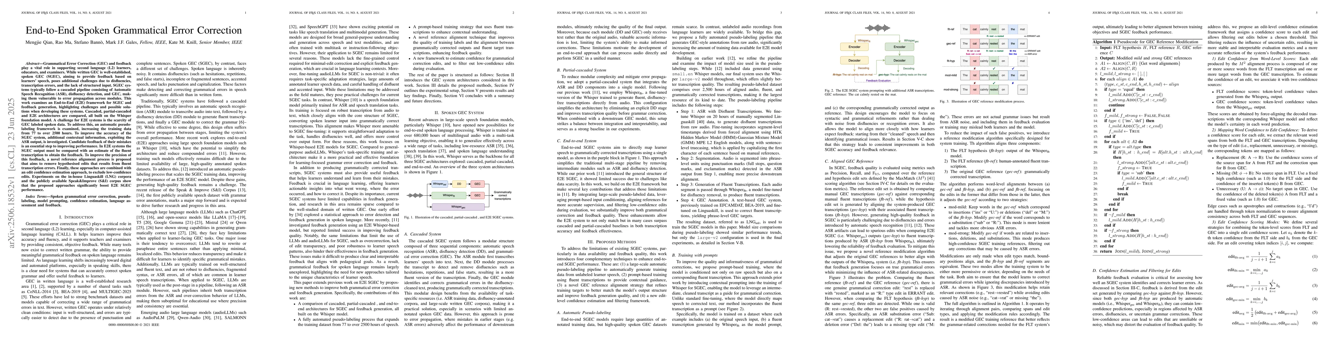 This research introduces an End-to-End framework for Spoken Grammatical Error Correction (SGEC) and feedback generation, addressing challenges like error propagation in cascaded systems. By using the Whisper foundation model, they compare E2E, partial-cascaded, and traditional architectures. To tackle scarce SGEC labeled spoken data, an automatic pseudo-labeling framework expands training data. Additional context from ASR output and a novel reference alignment process improve SGEC accuracy. Experiments on Linguaskill and Speak & Improve corpora demonstrate significant performance enhancement with these approaches.